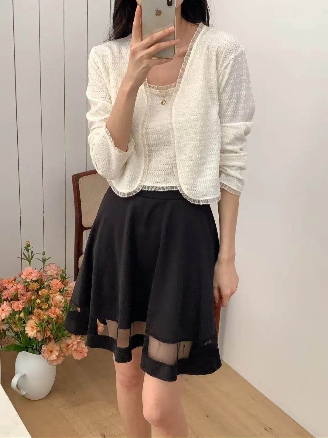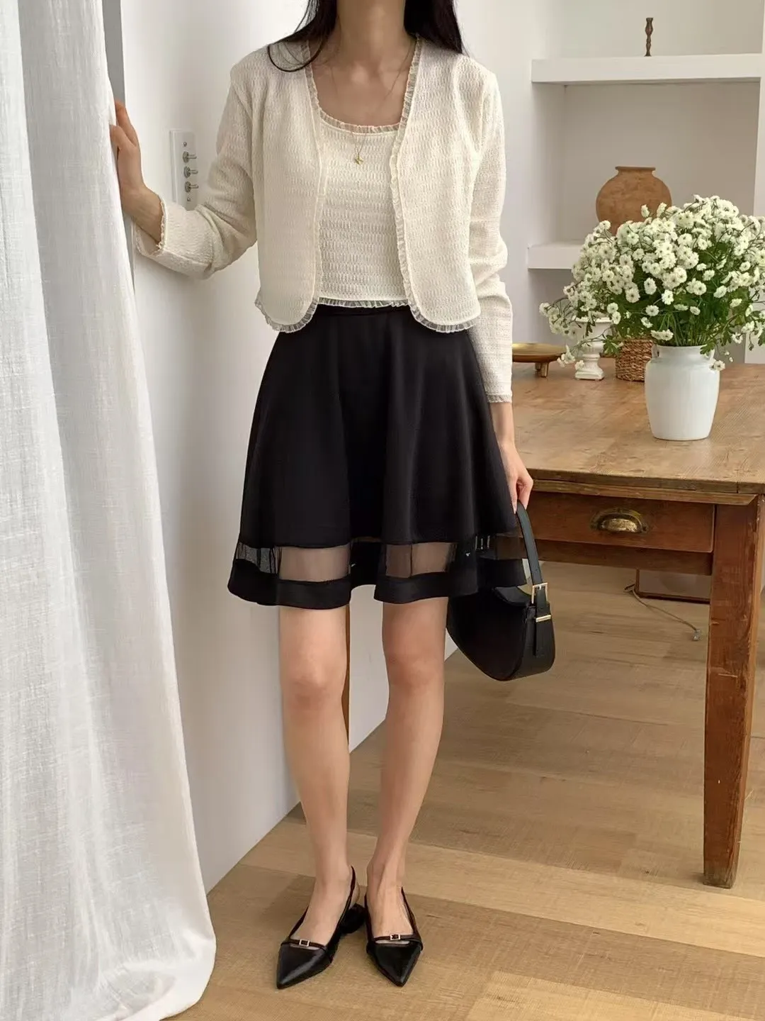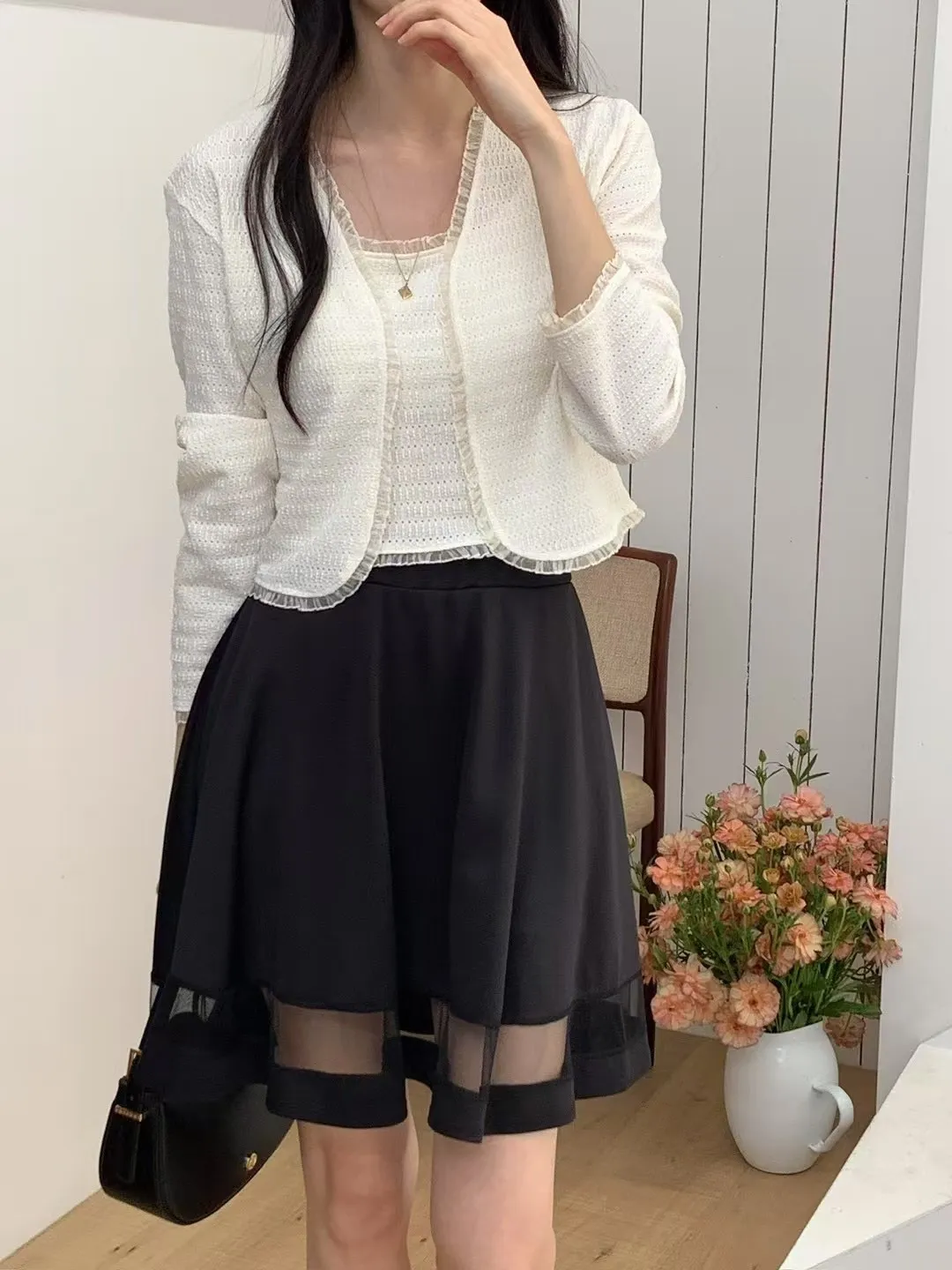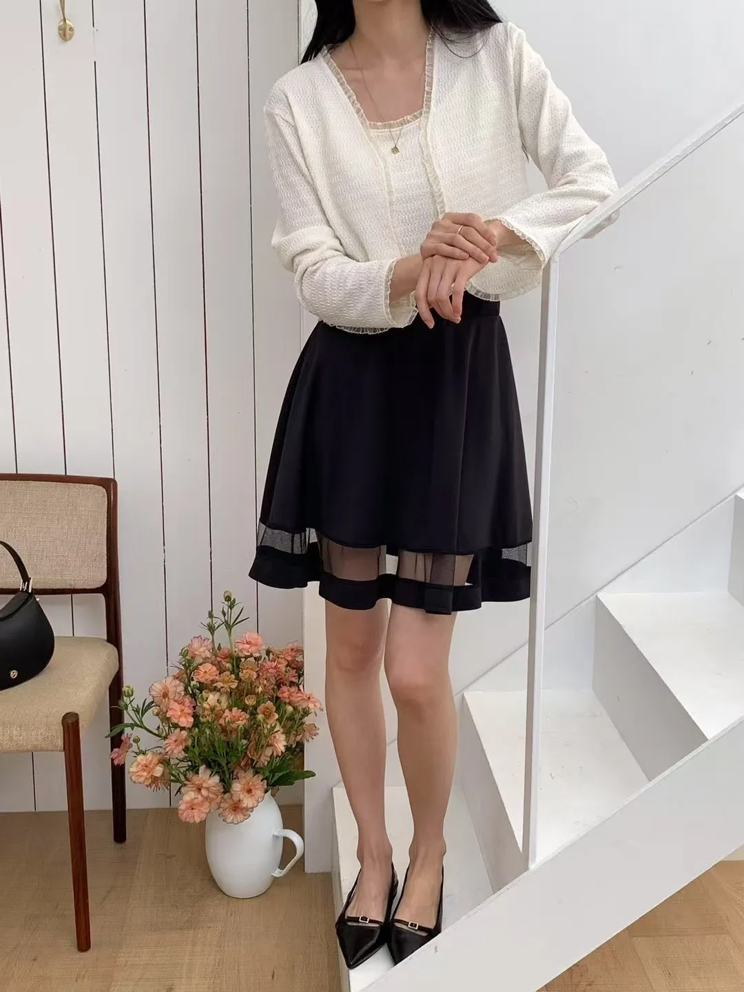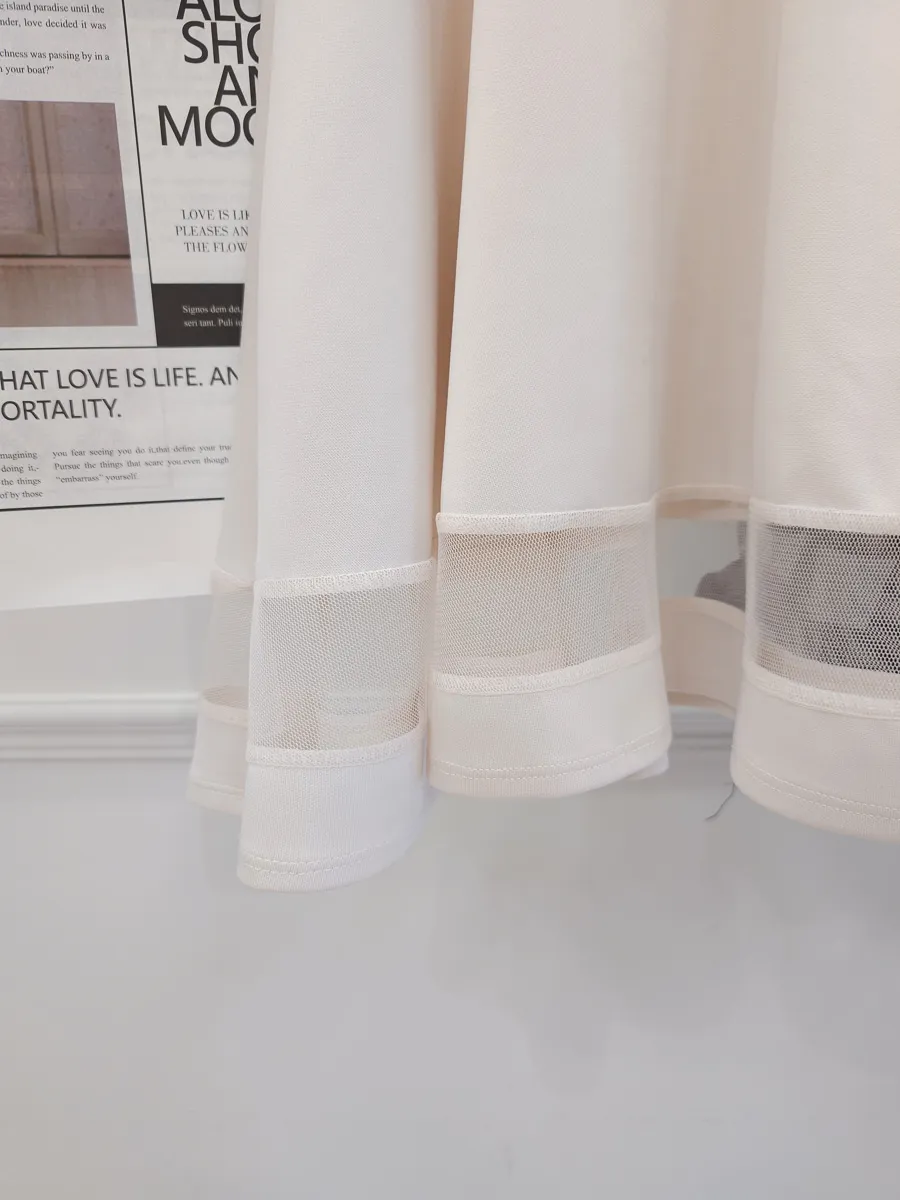 正韓 拼接透紗波浪短裙 2色