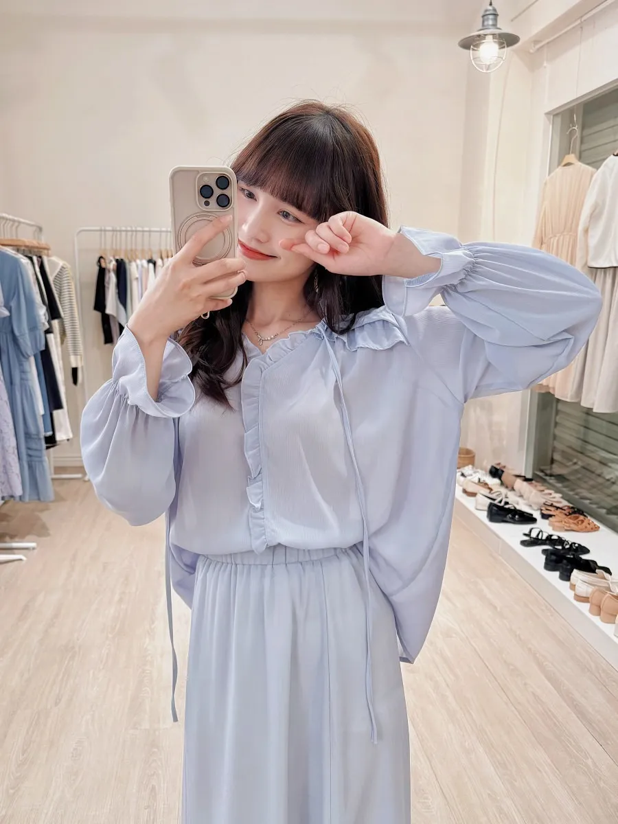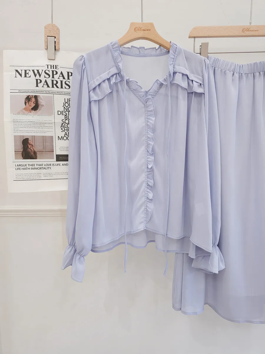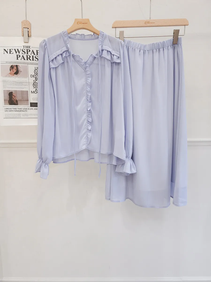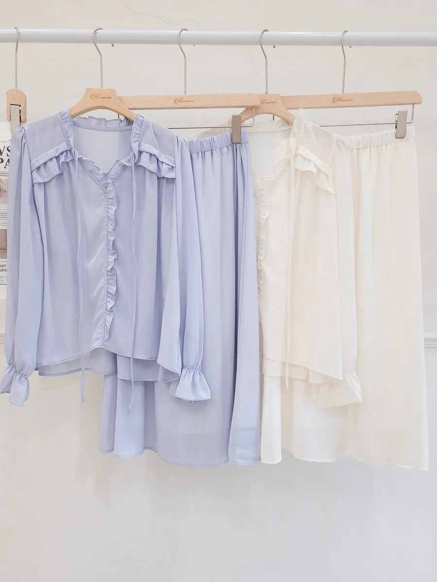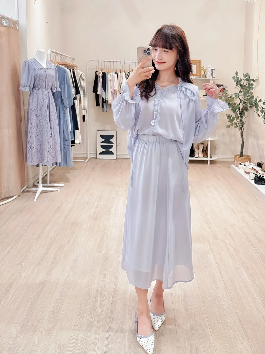 正韓 波浪皺摺雪紡中裙Set 2色
