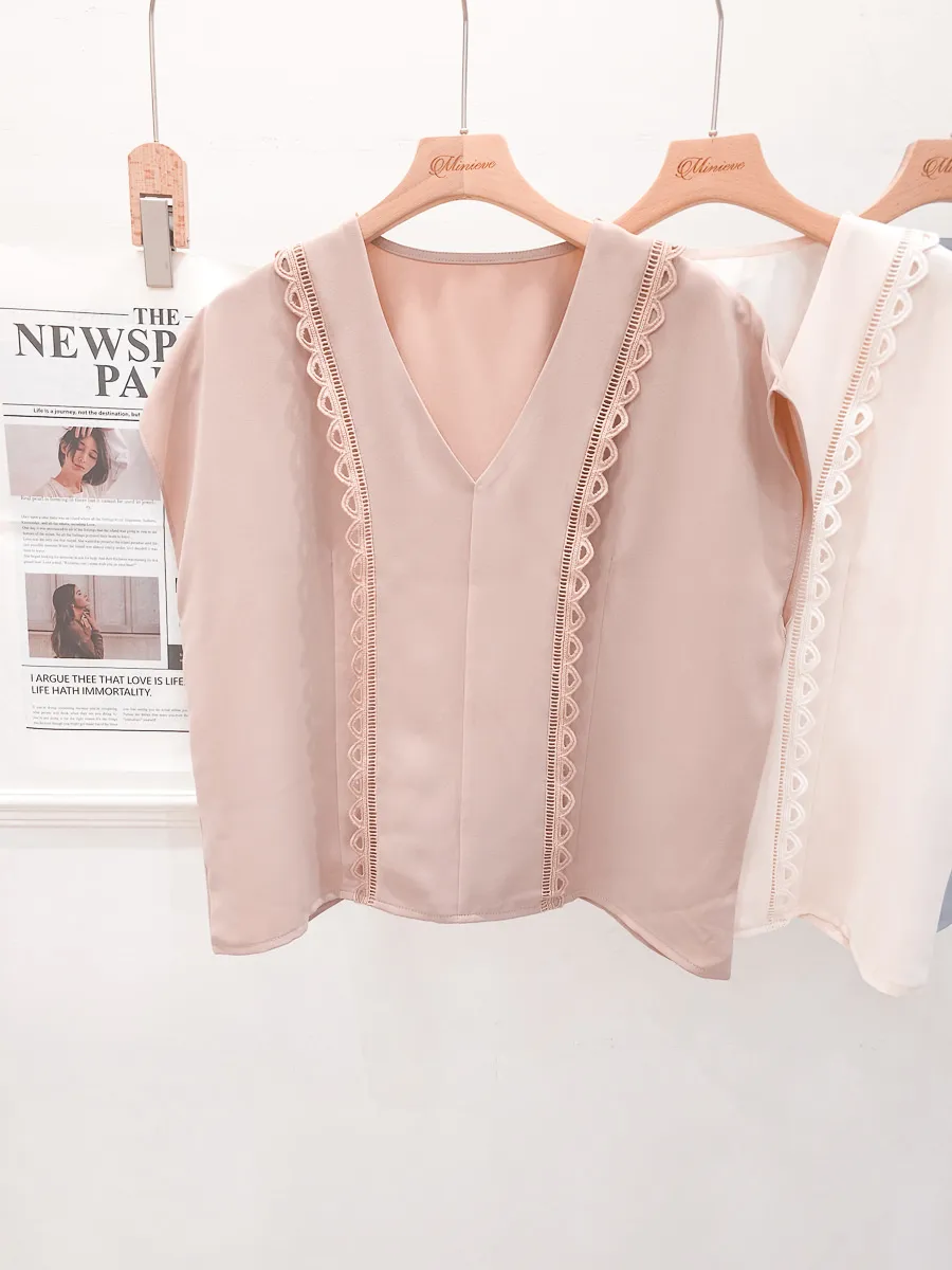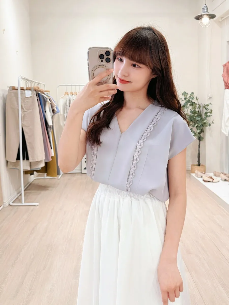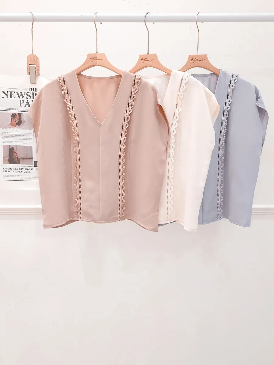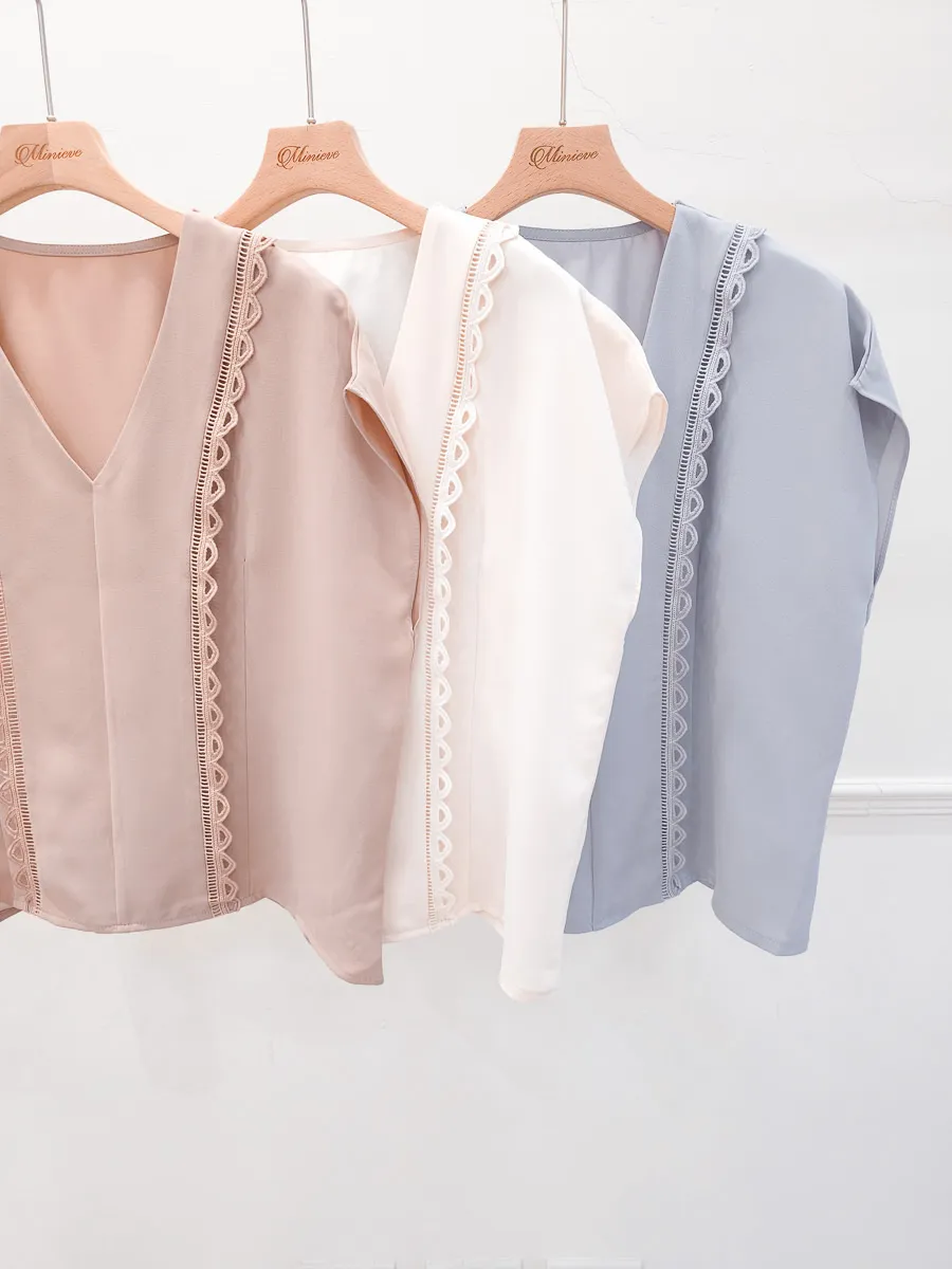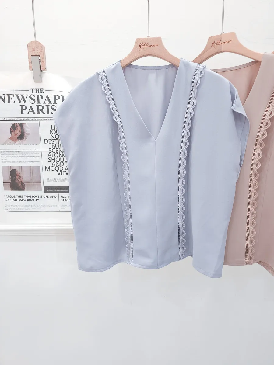 正韓 V領波浪蕾絲滾邊上衣 3色