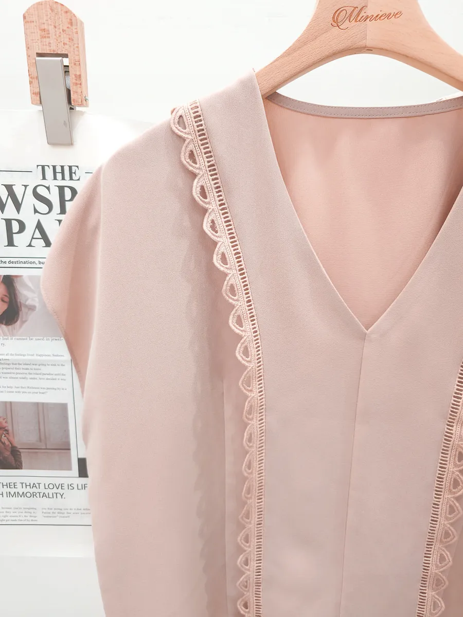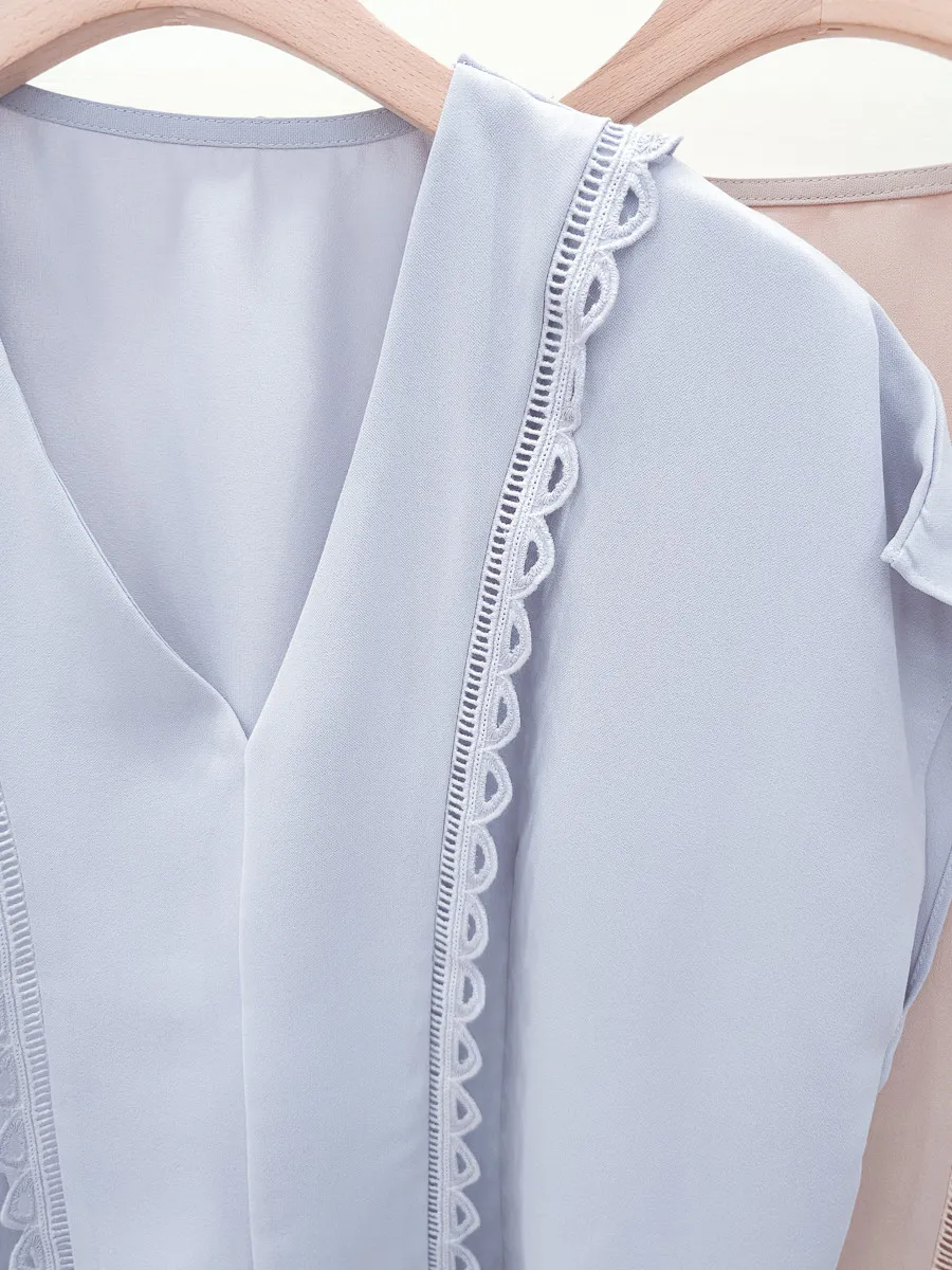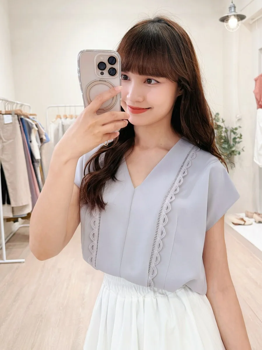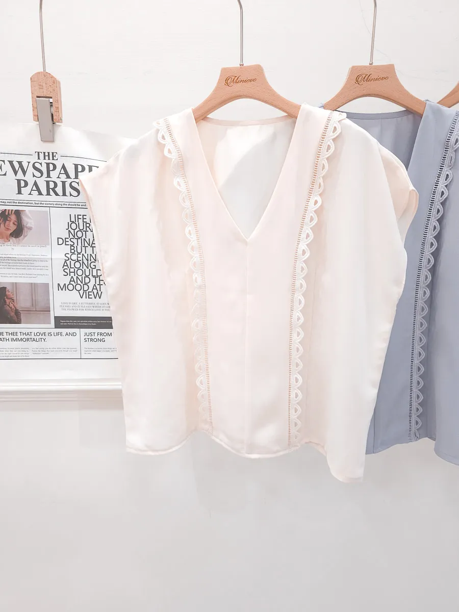 正韓 V領波浪蕾絲滾邊上衣 3色