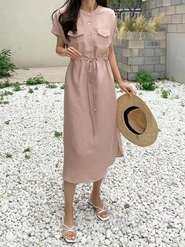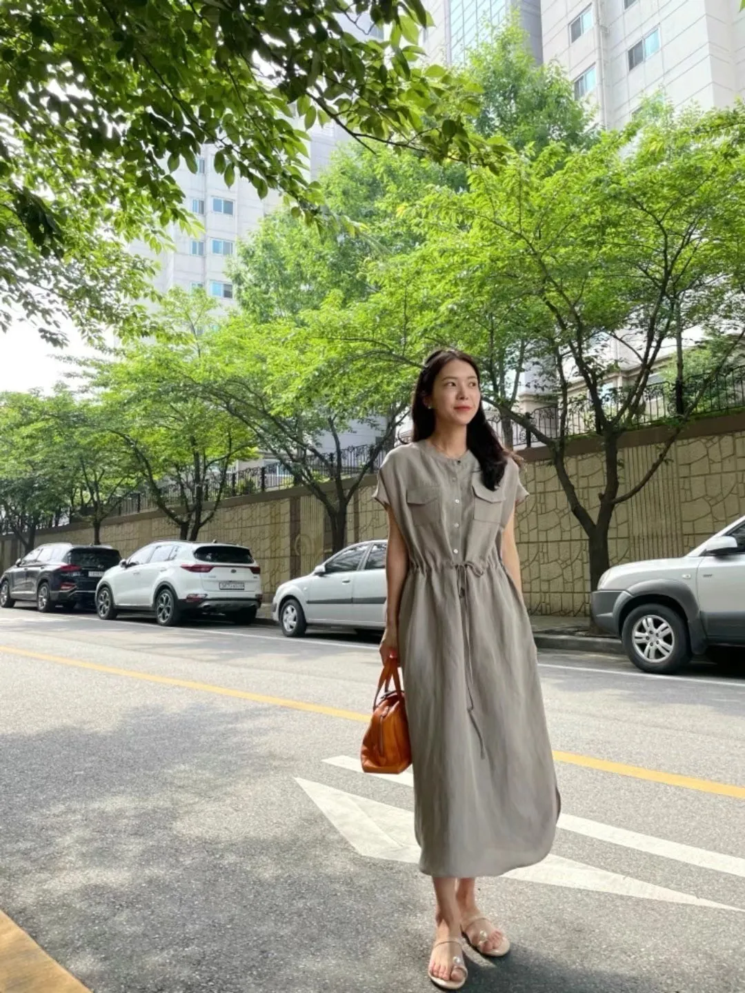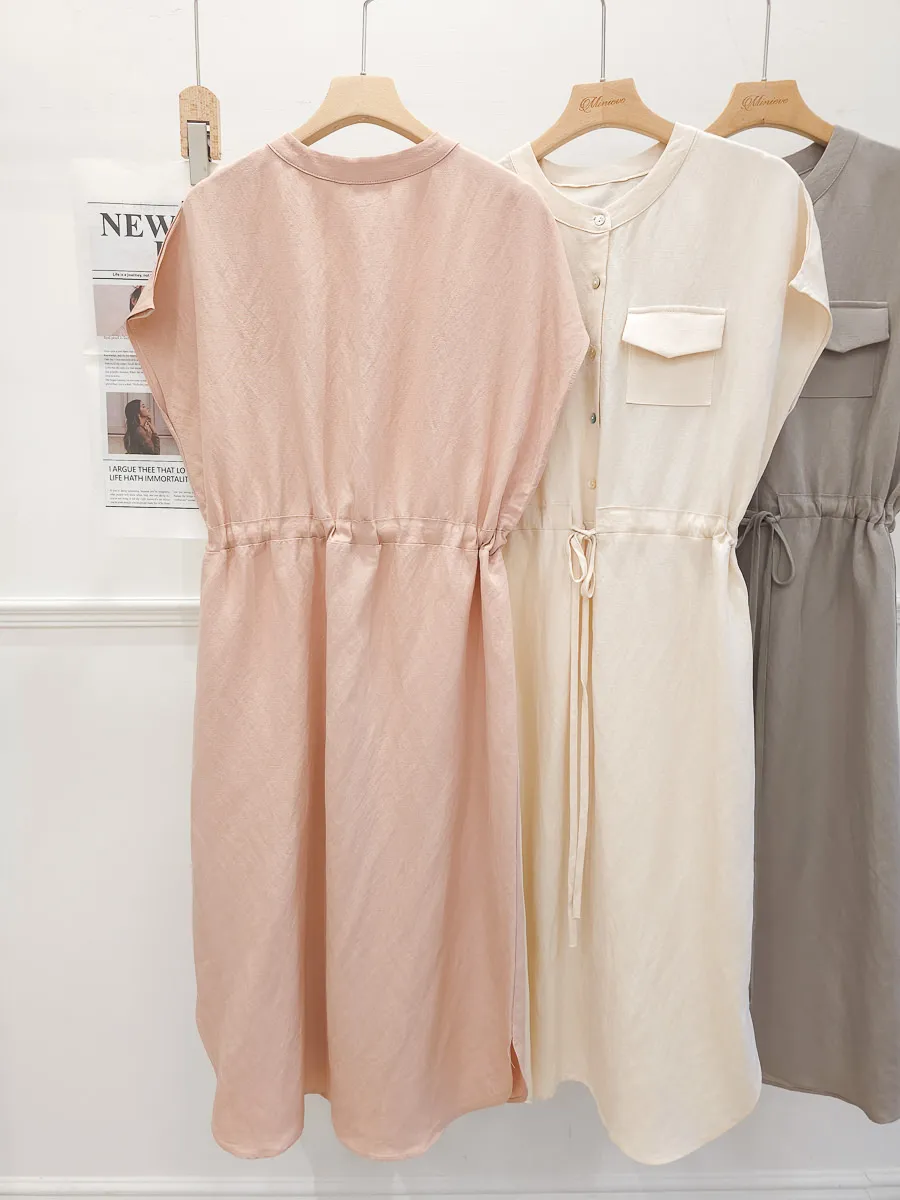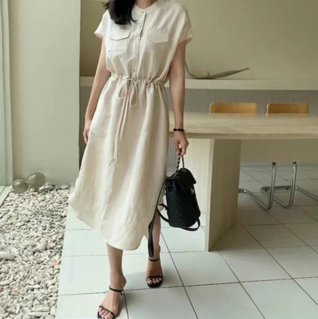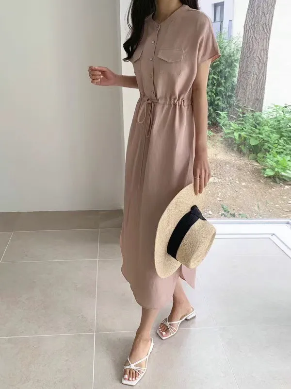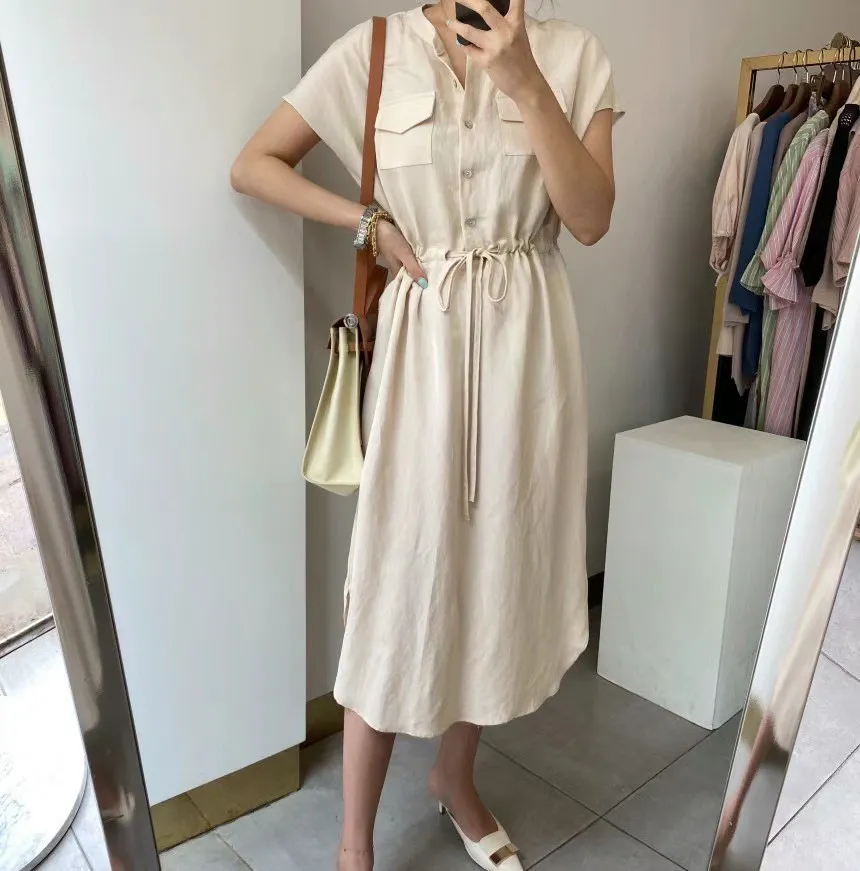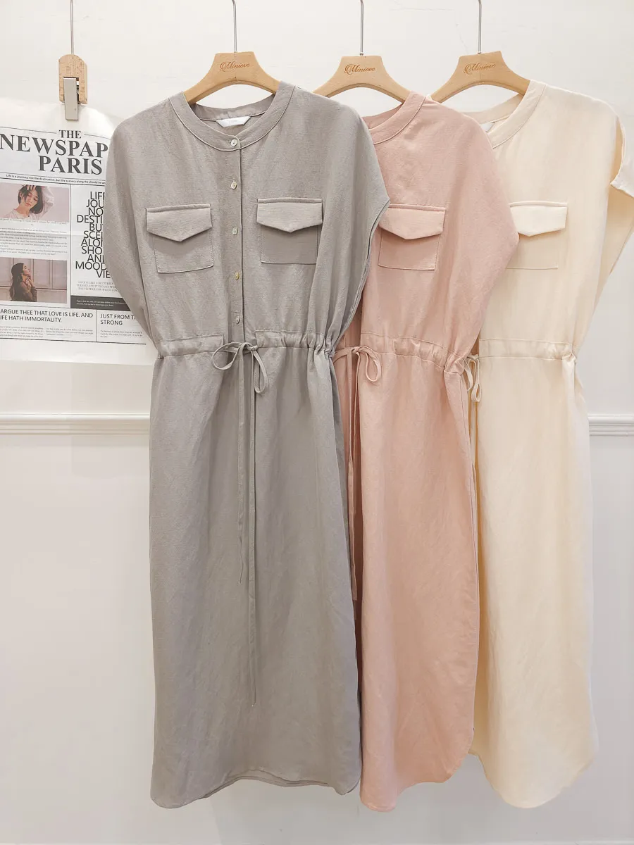 正韓 排扣抽繩縮腰連身洋裝 3色