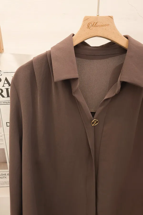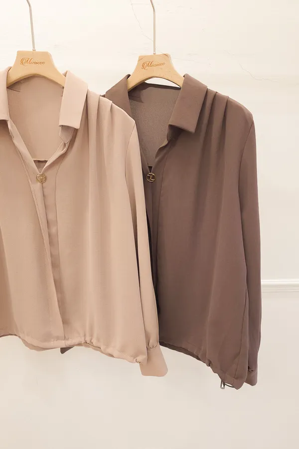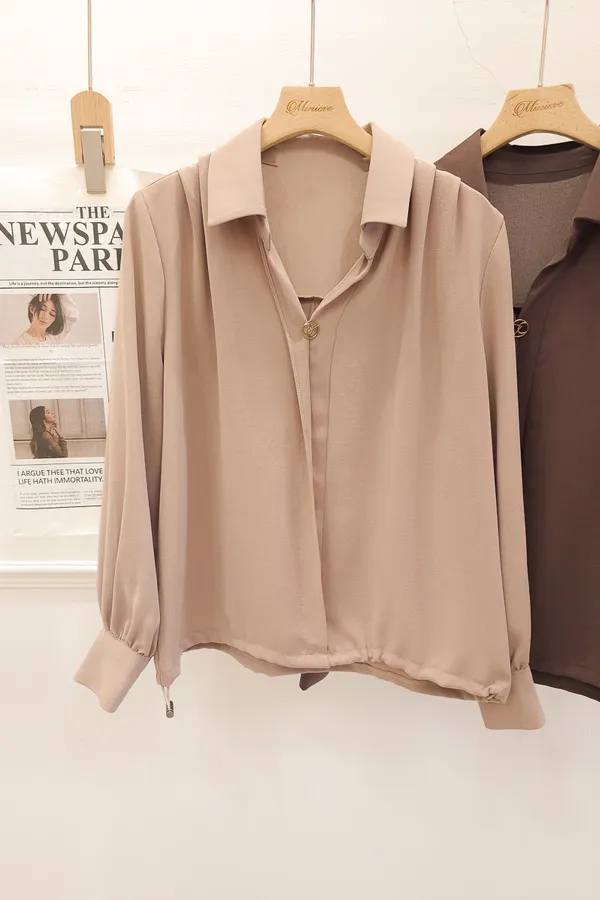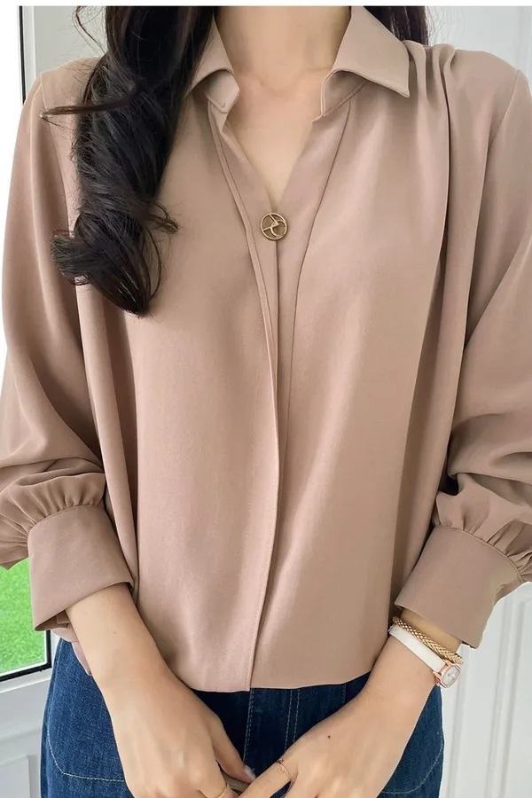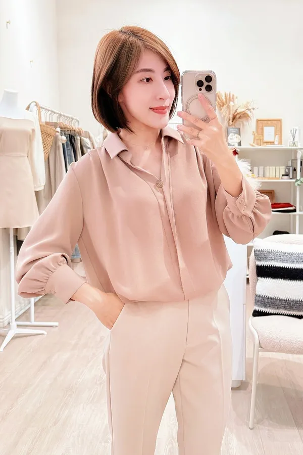 17.正韓 金屬環扣翻領皺袖上衣 2色