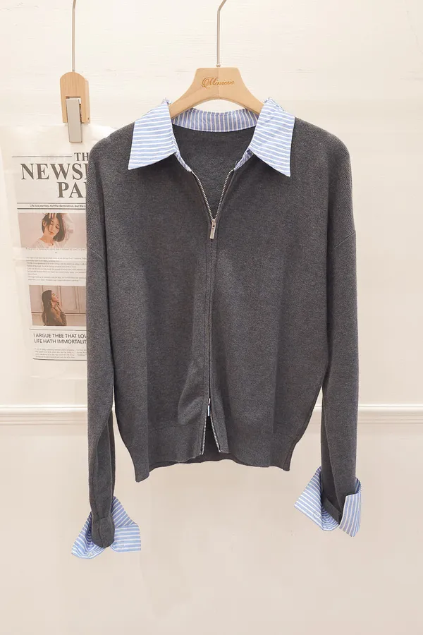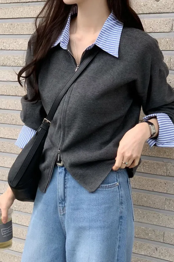 44.正韓 拼接條紋翻領拉鍊上衣