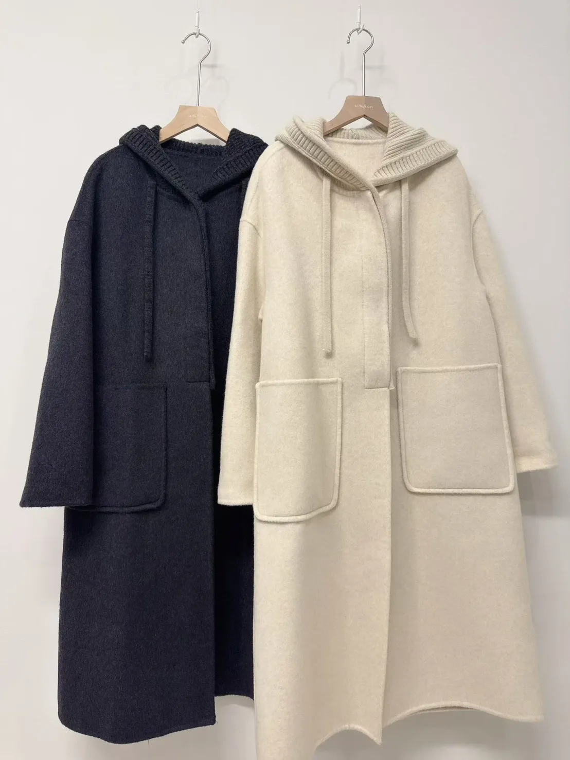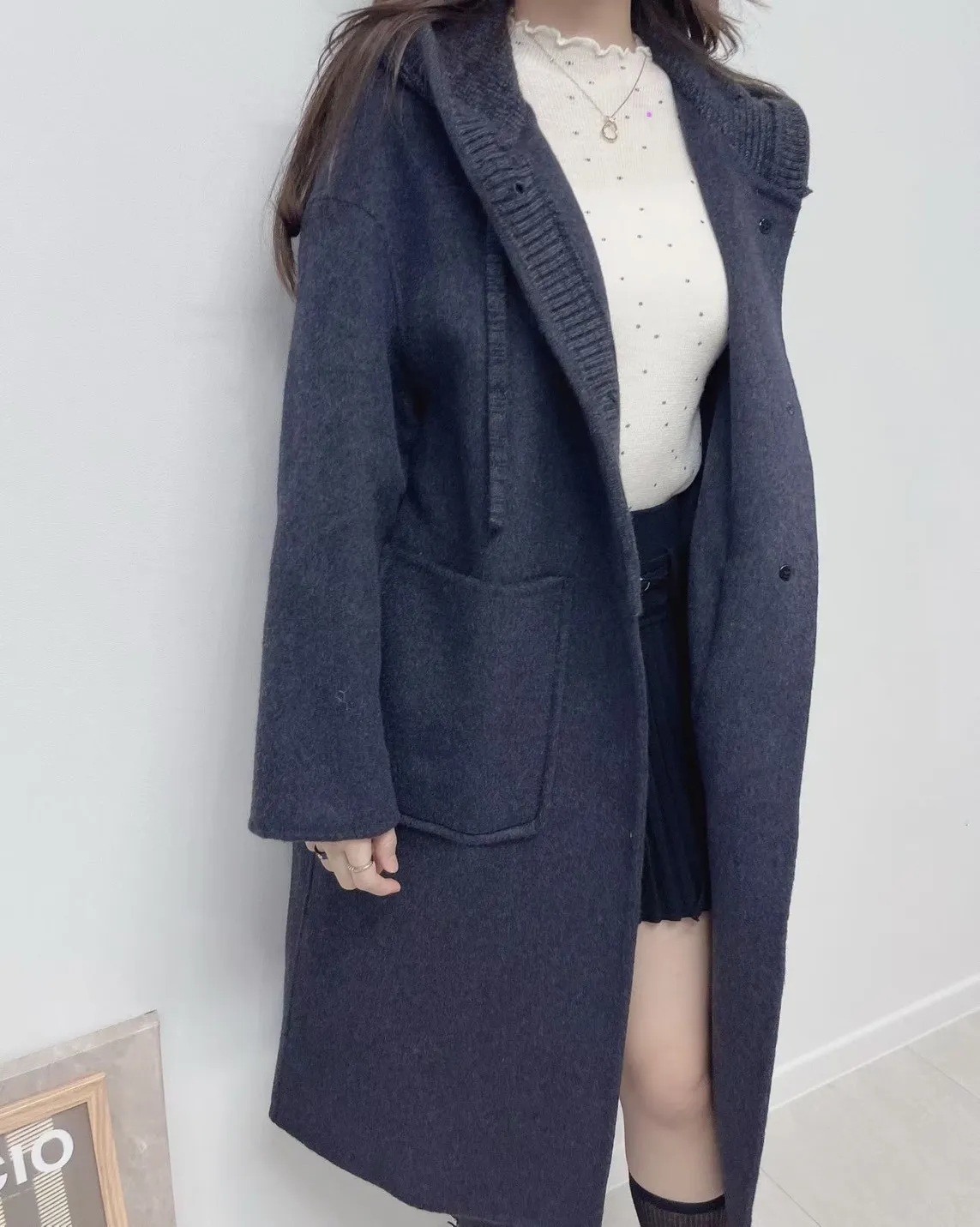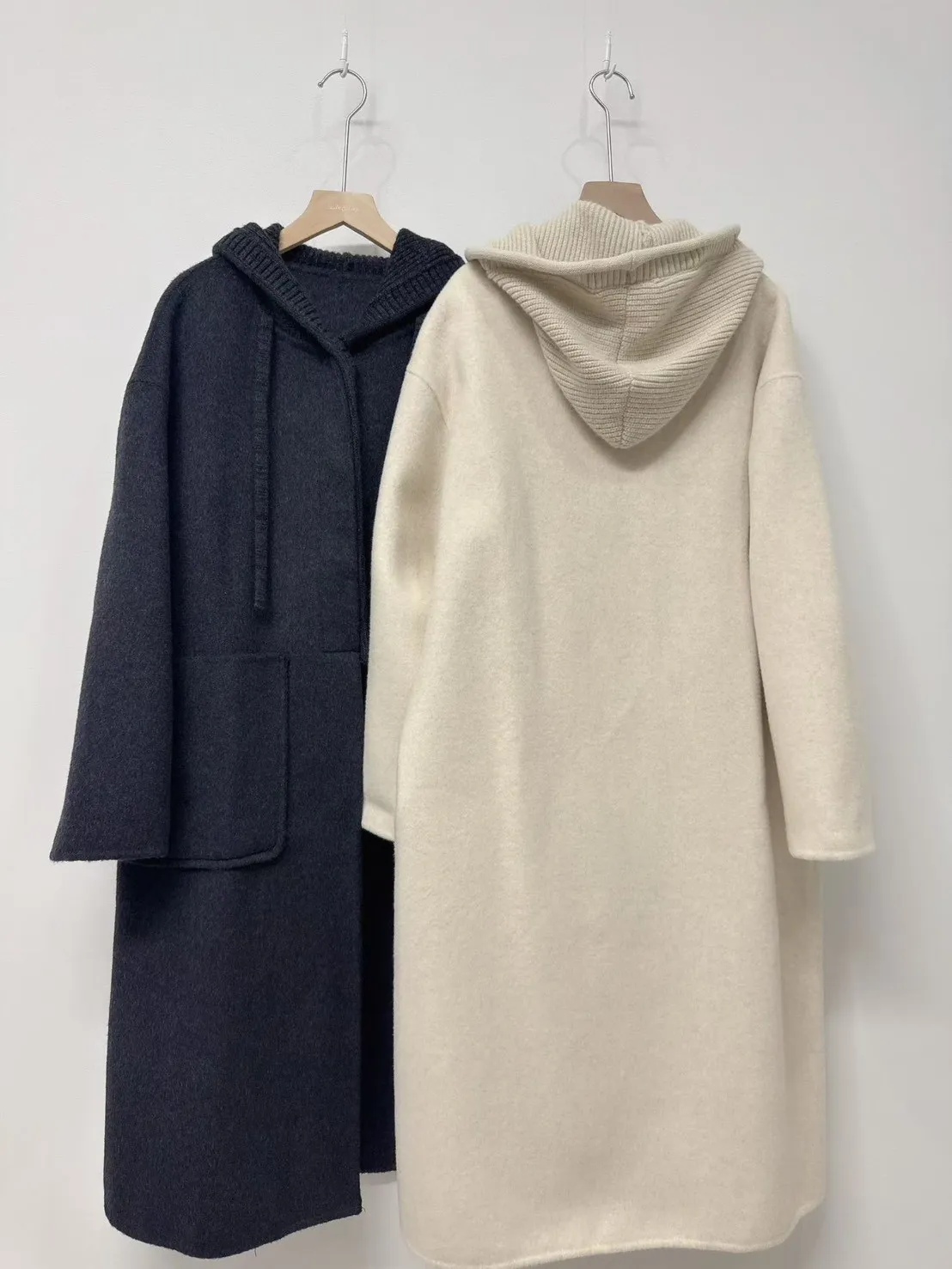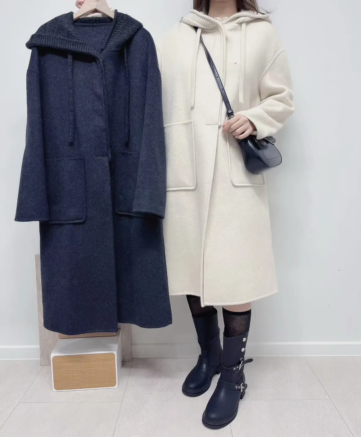 47.正韓 針織連帽口袋50%長版羊毛外套 2色