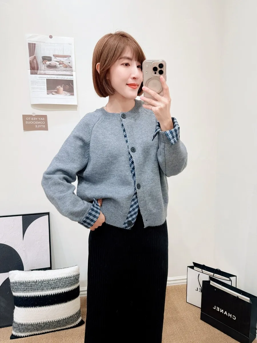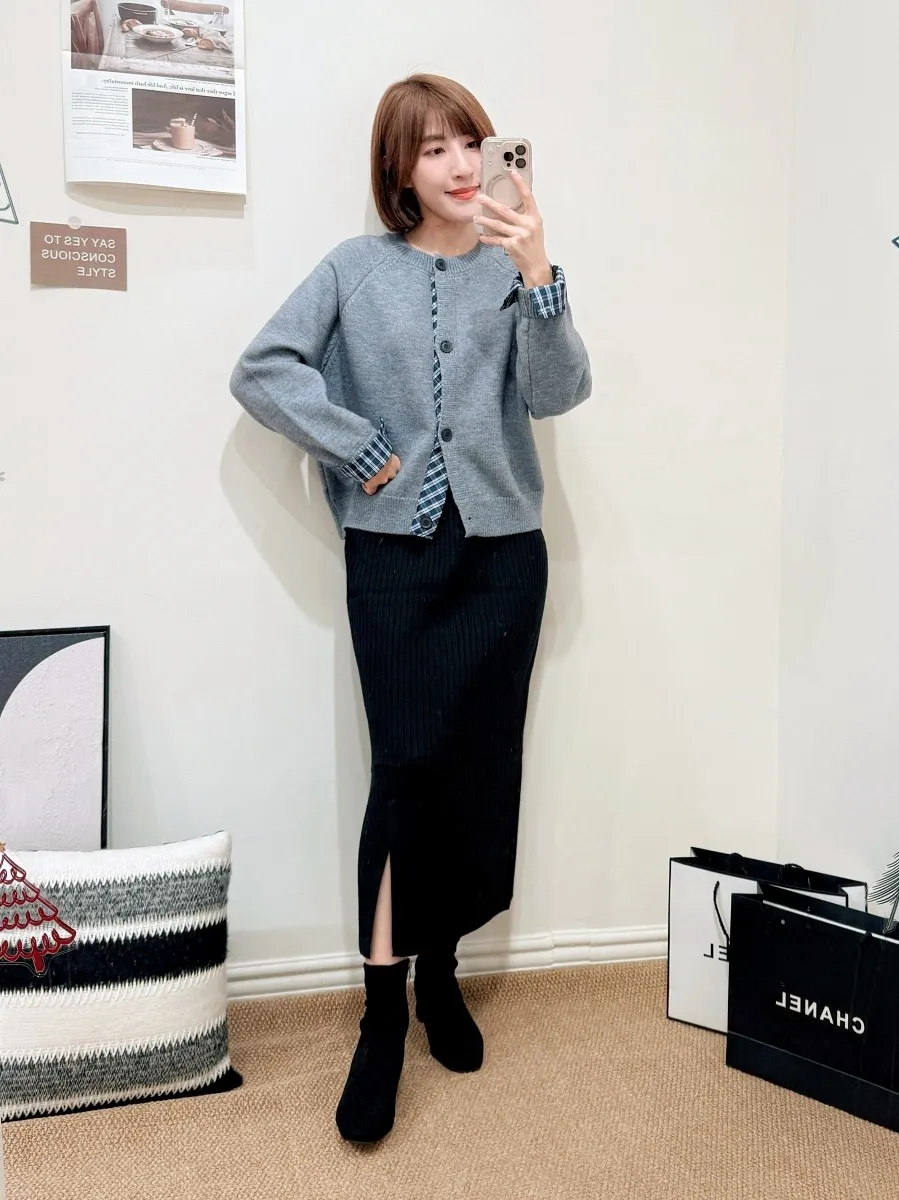 正韓 排釦格紋折袖上衣 3色