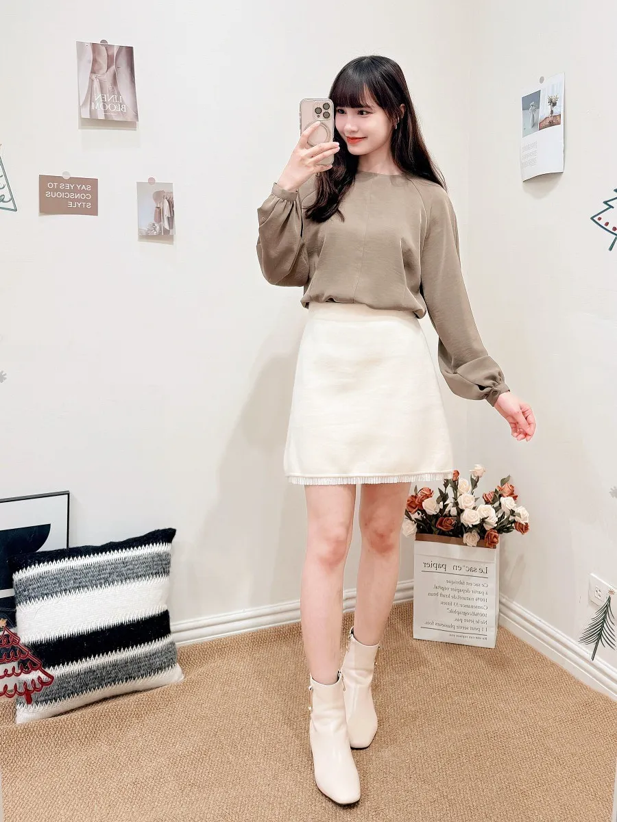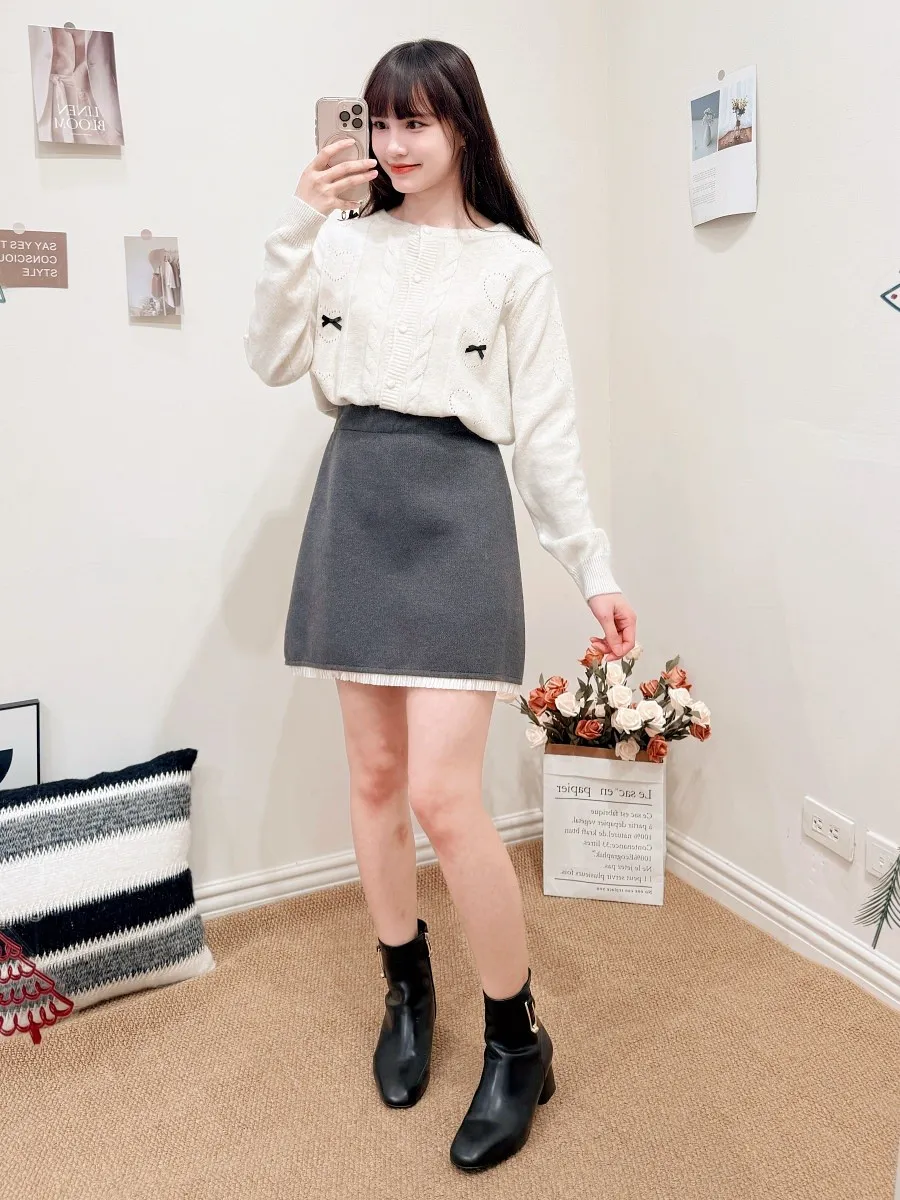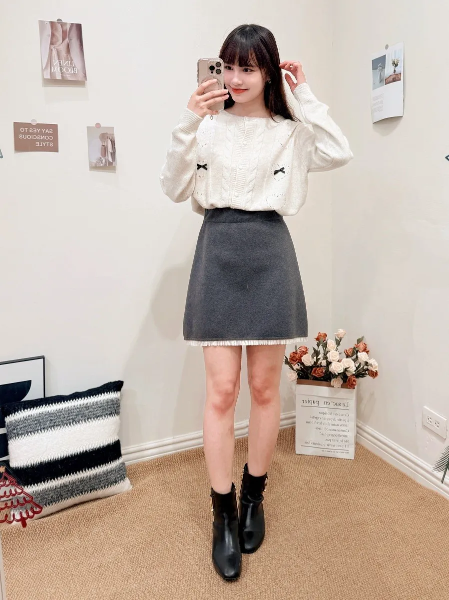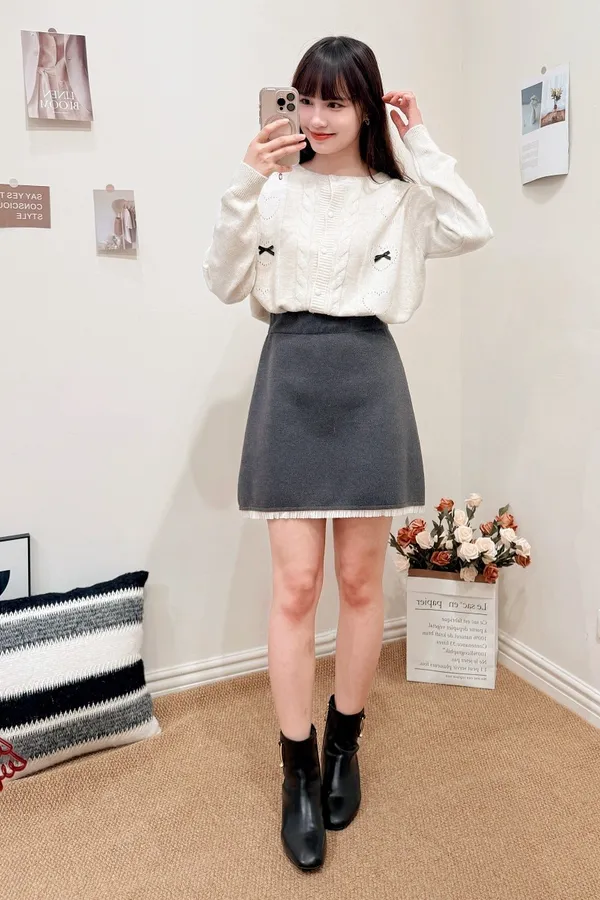 正韓 拼接細摺毛呢短裙 2色