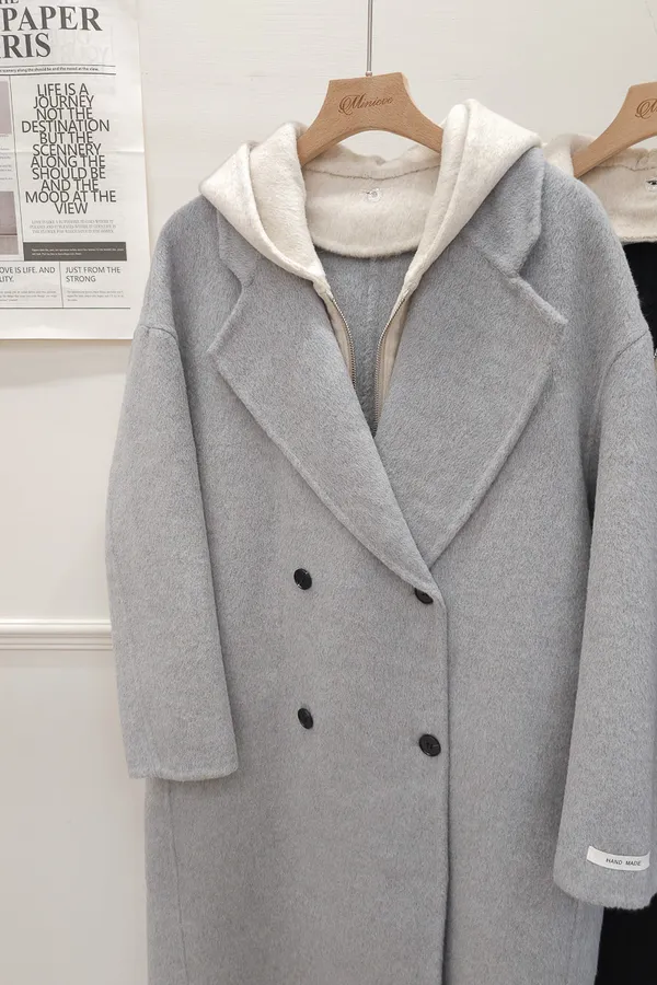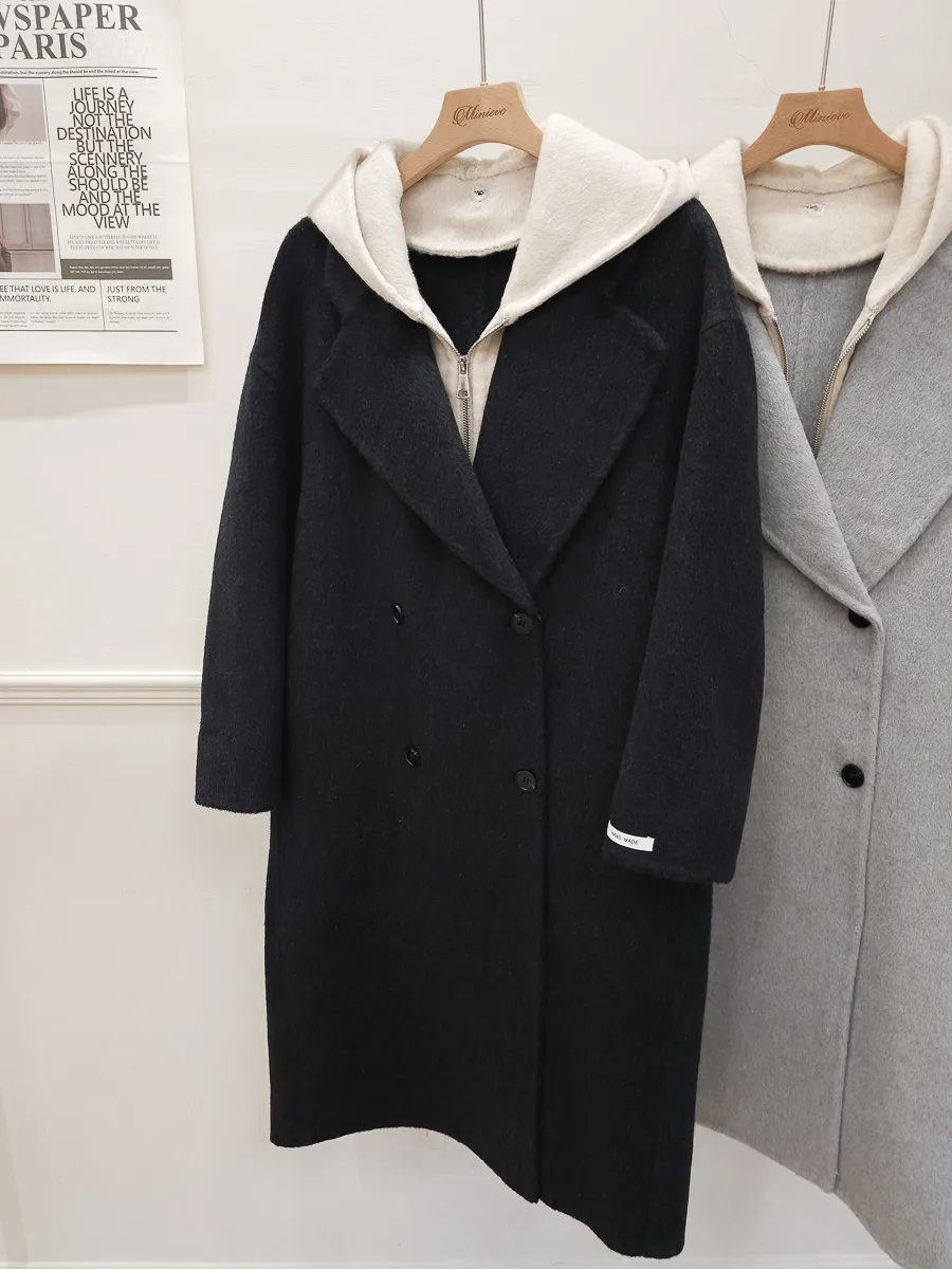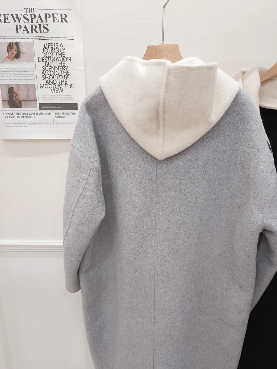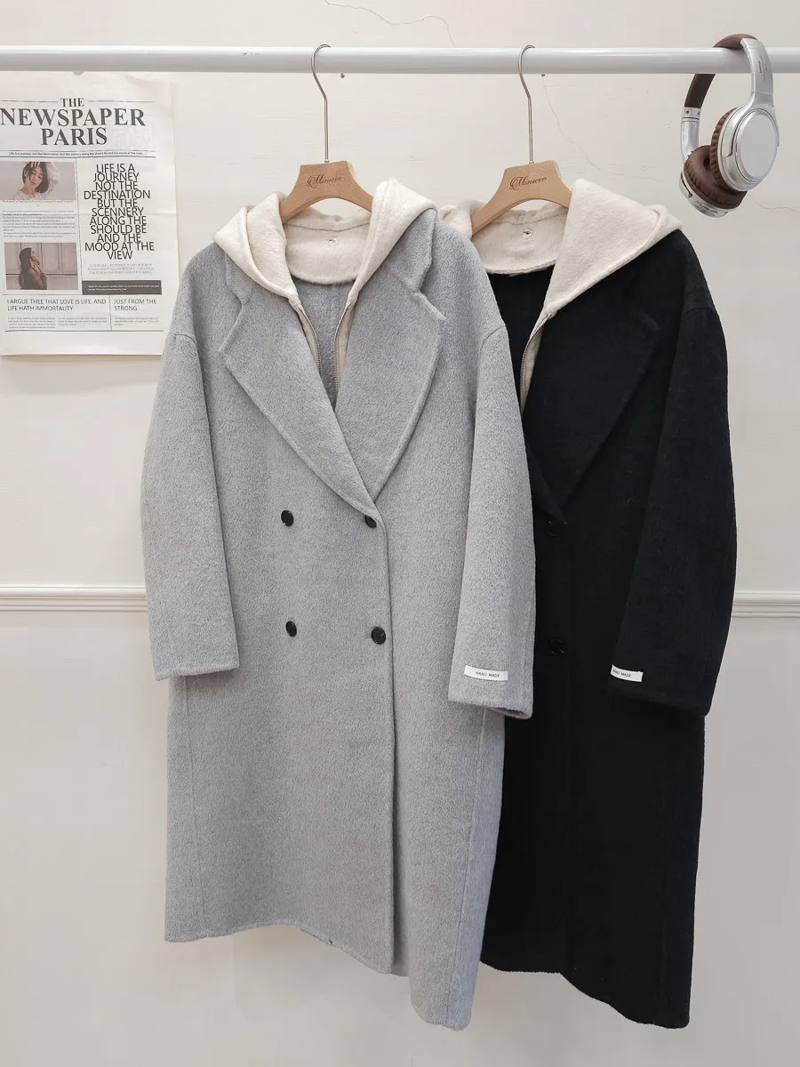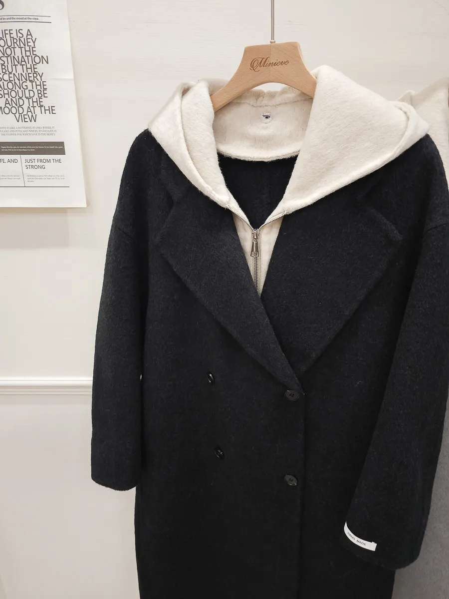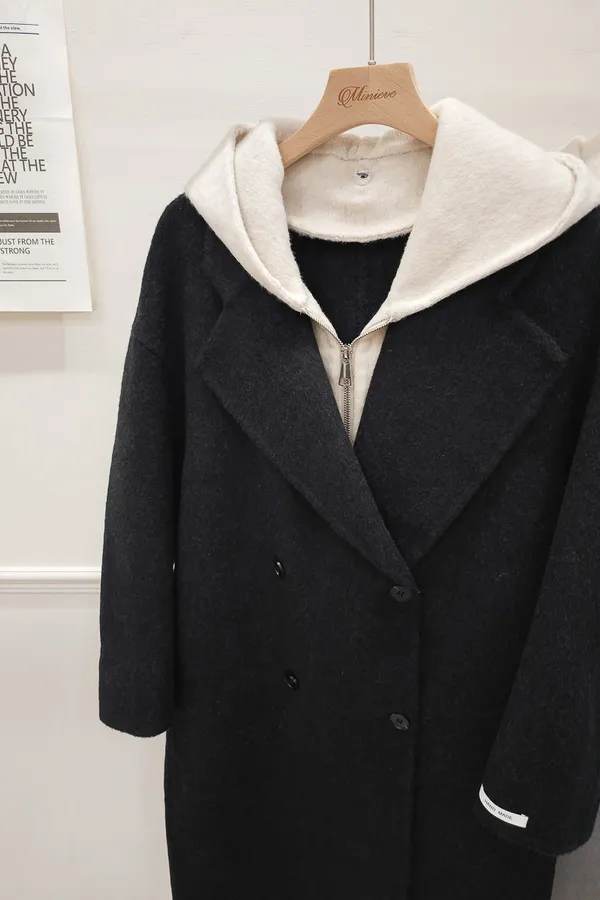 98.正韓 假兩件連帽100%羊毛大衣 2色