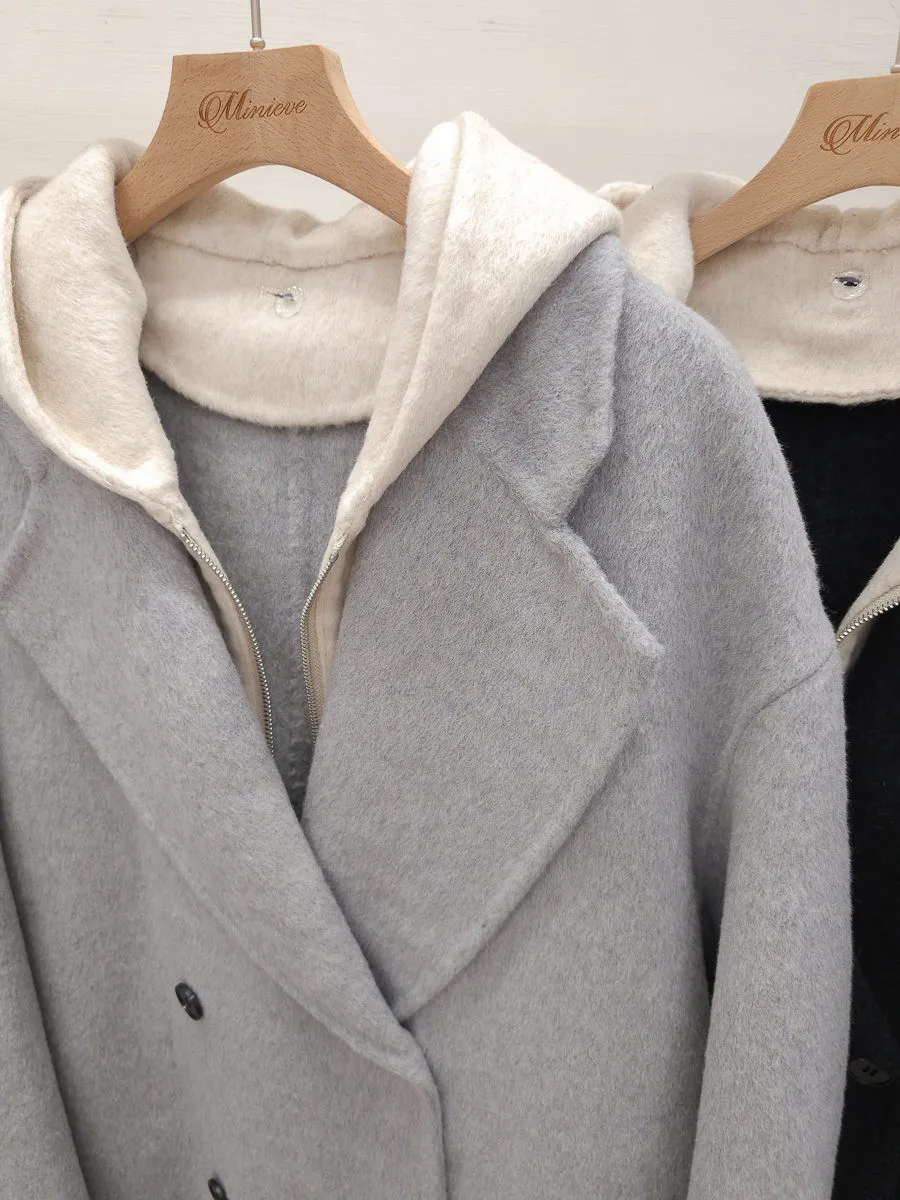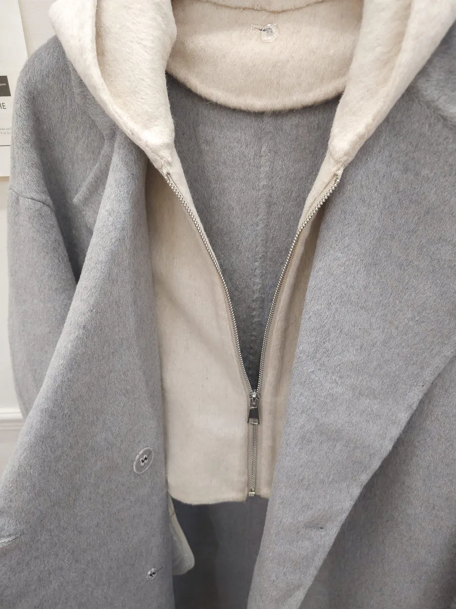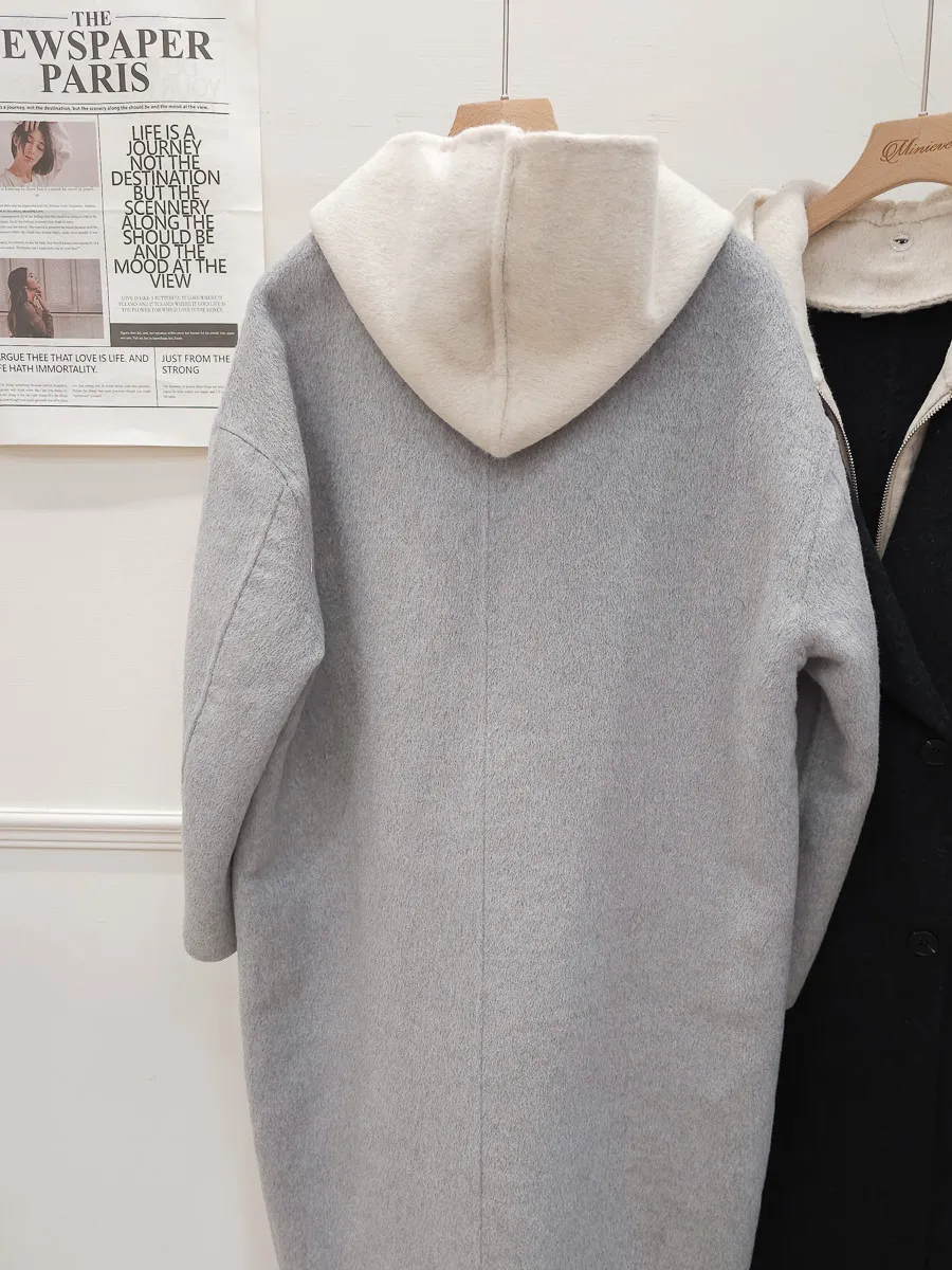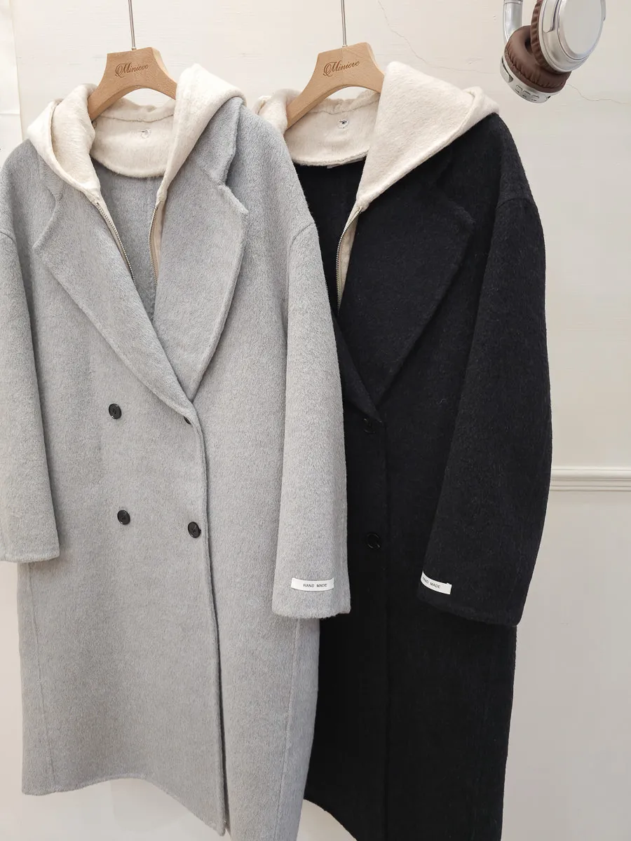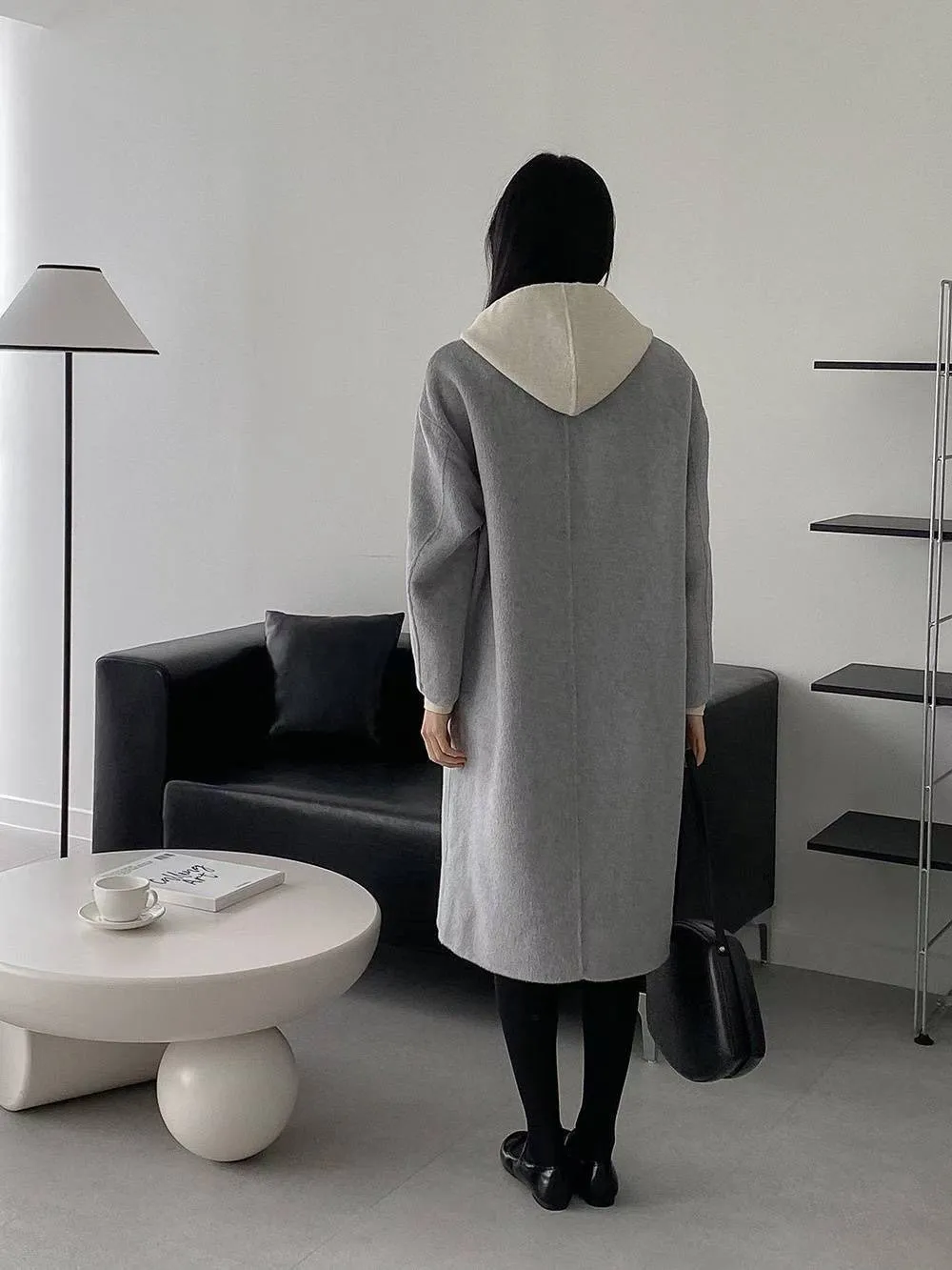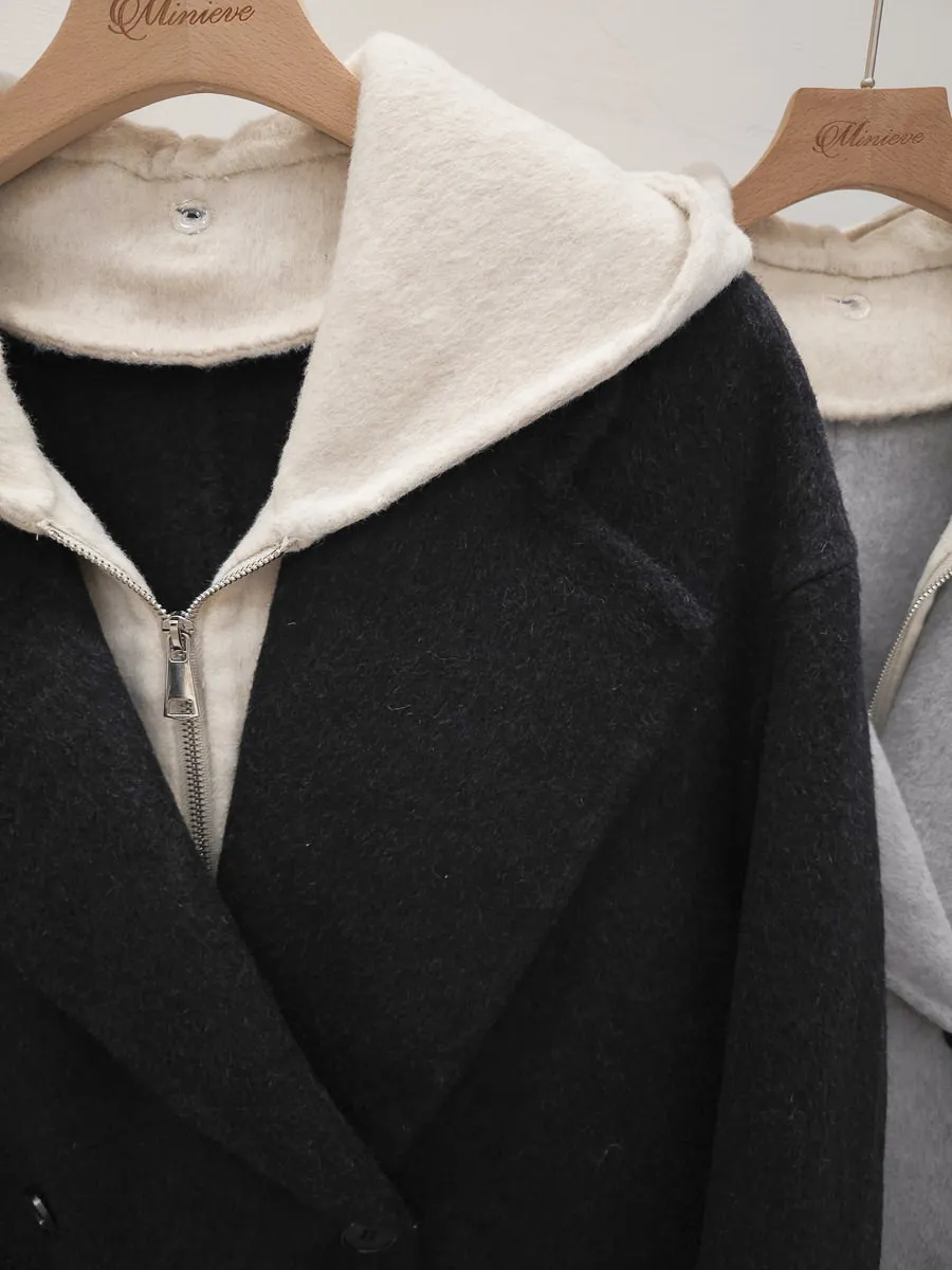 98.正韓 假兩件連帽100%羊毛大衣 2色