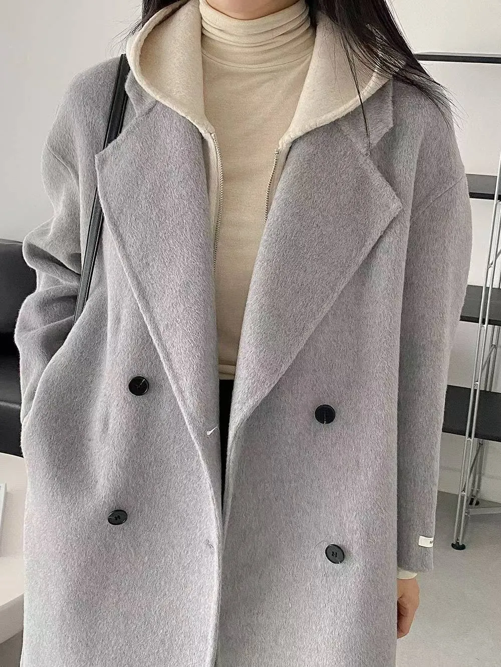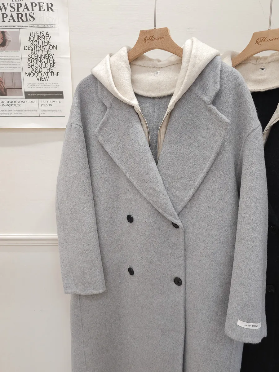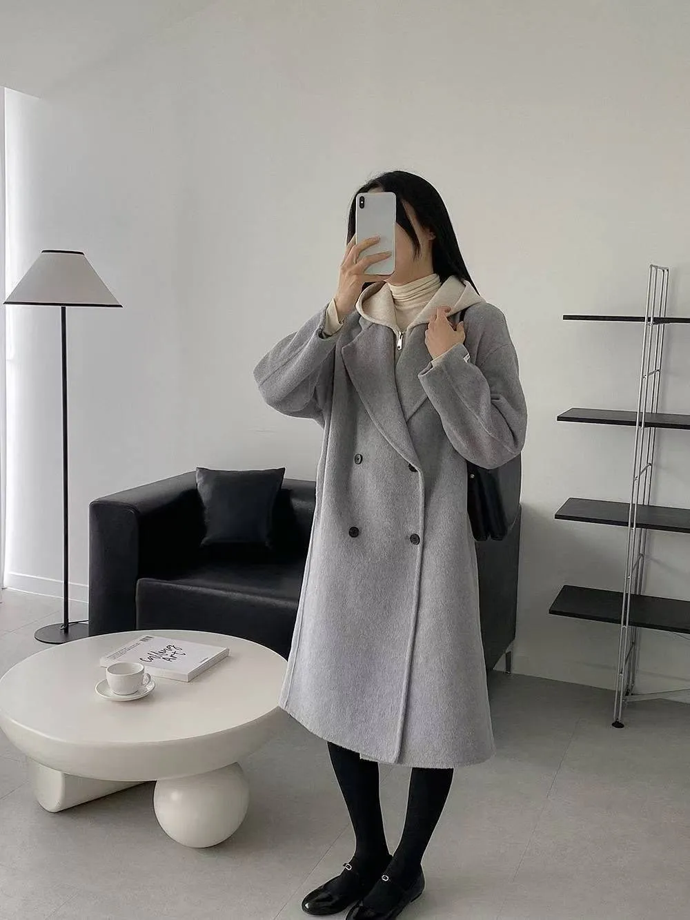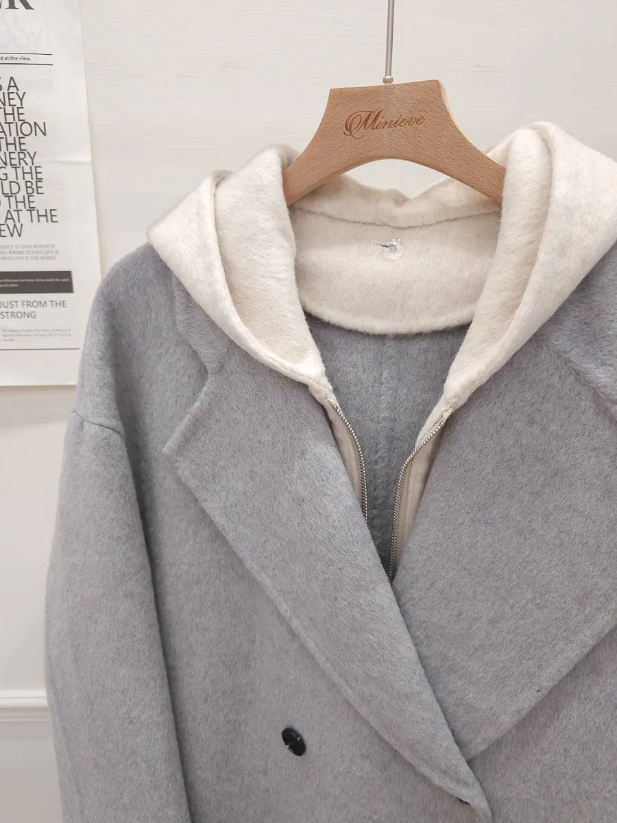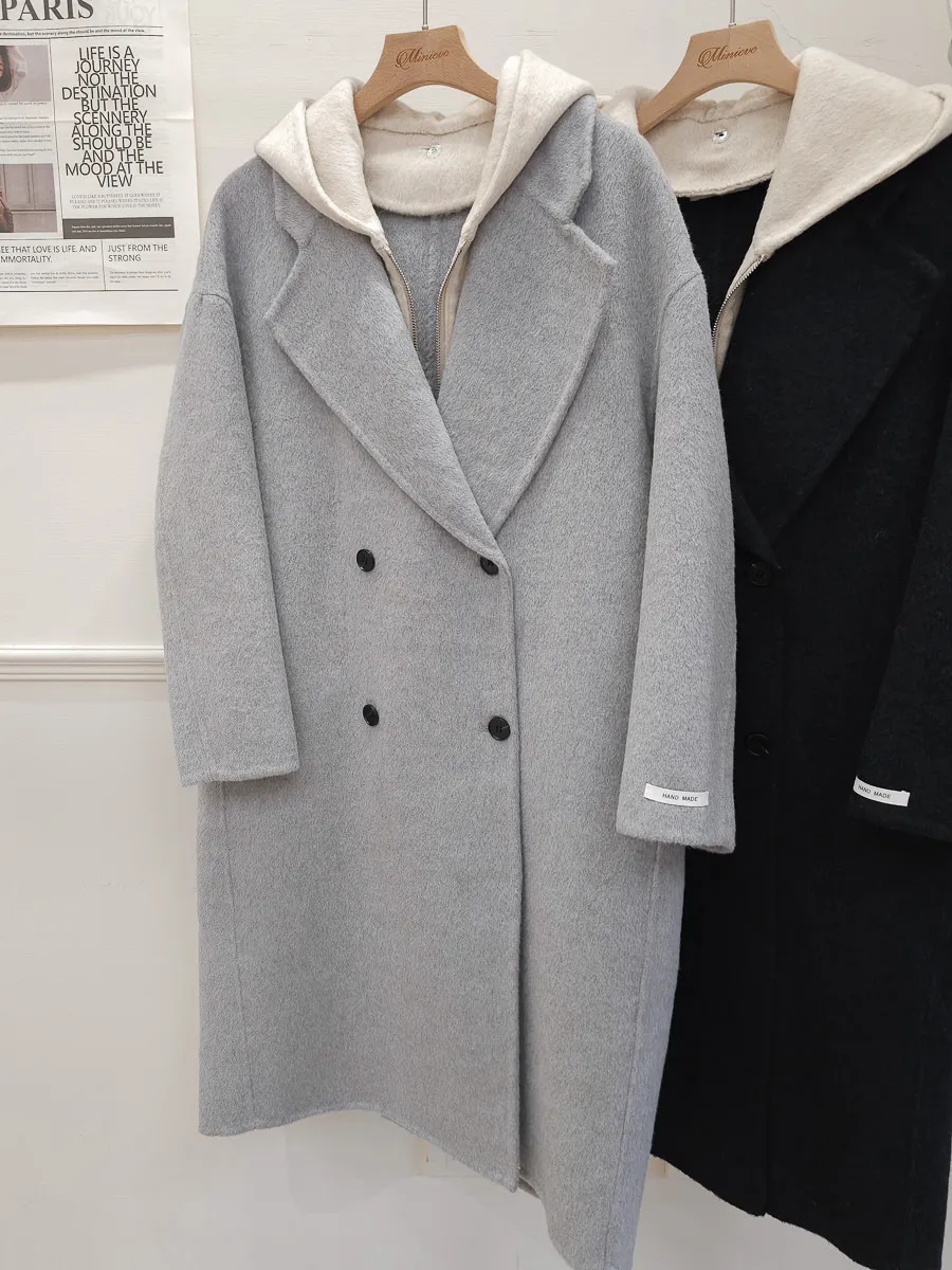 98.正韓 假兩件連帽100%羊毛大衣 2色