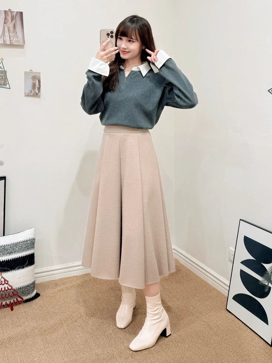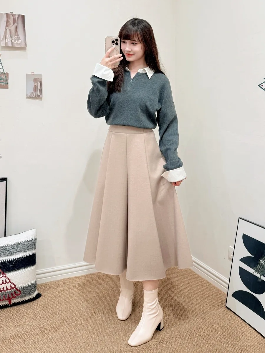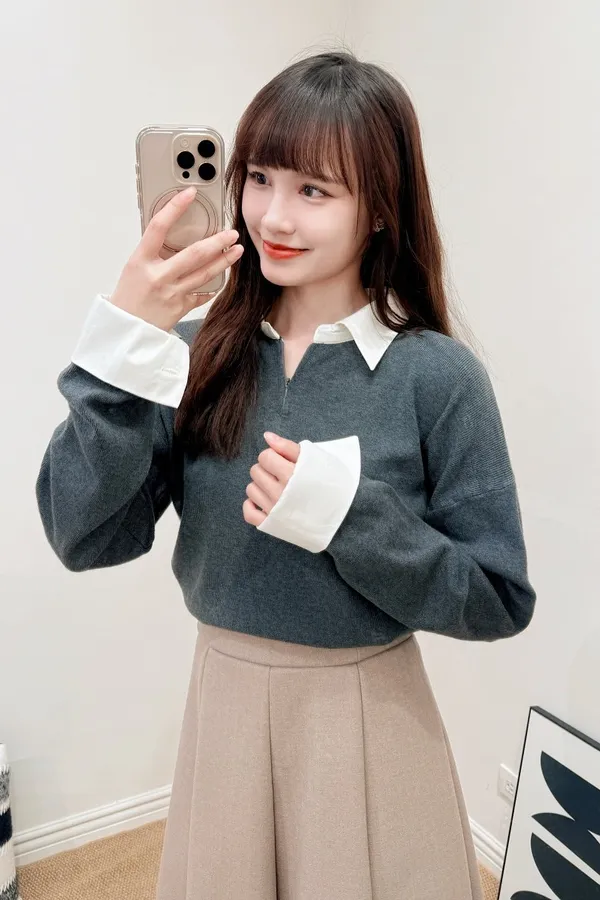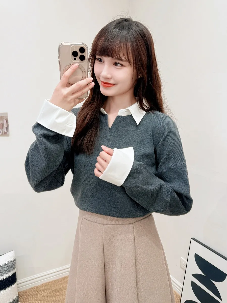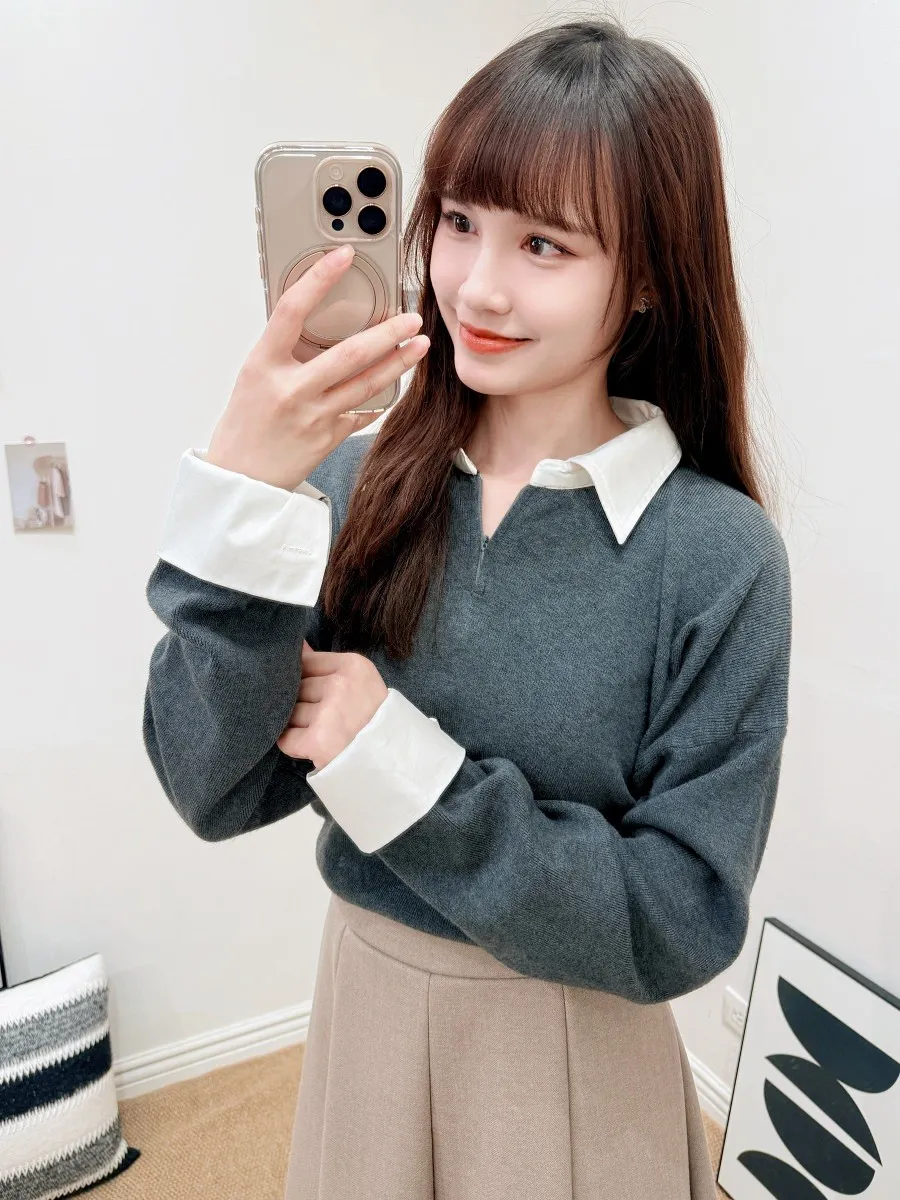 正韓 假兩件襯衫翻領針織上衣 2色