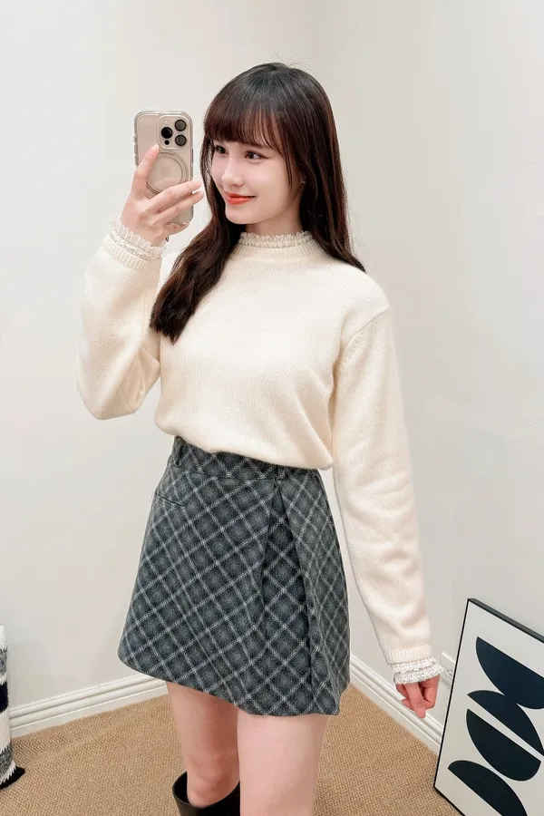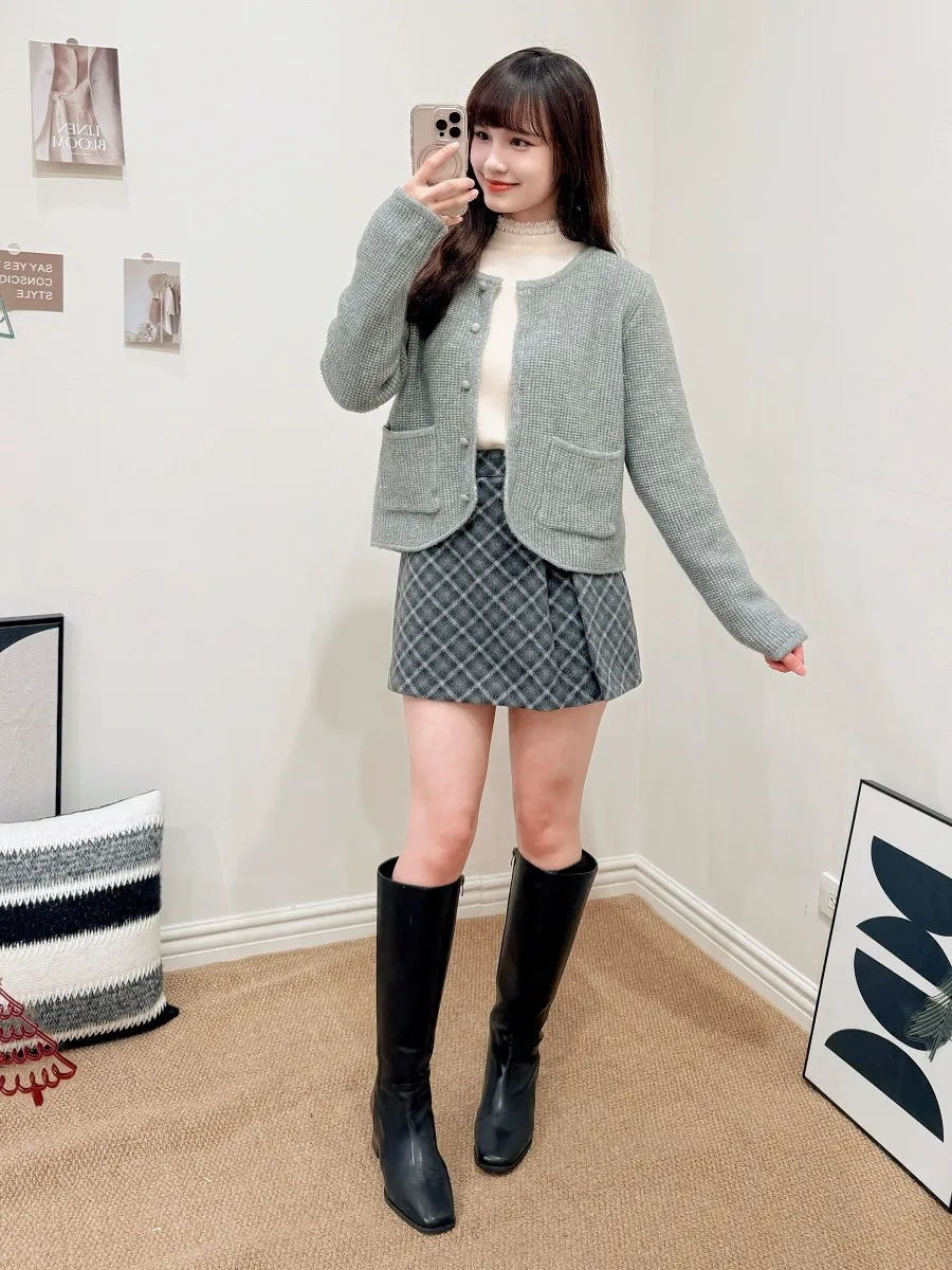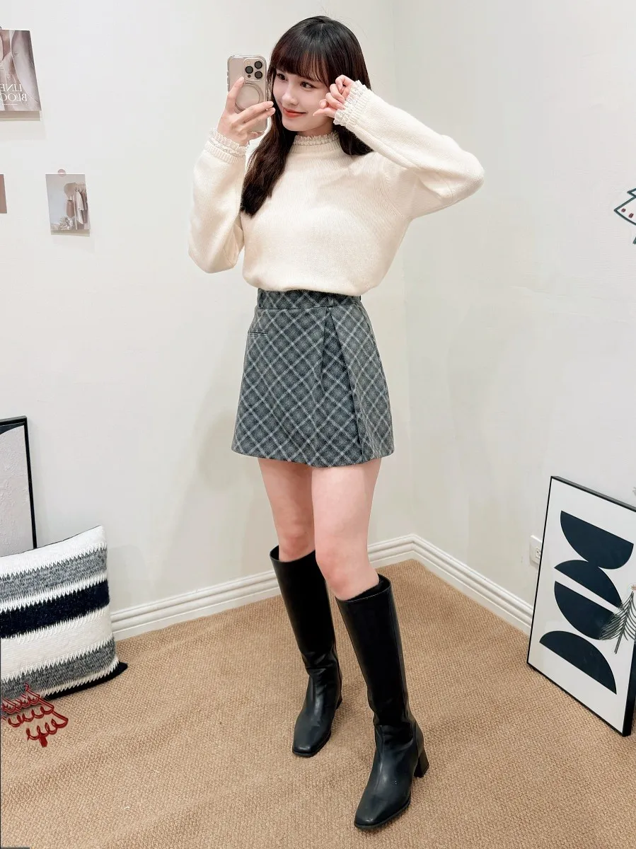 正韓 側開叉格紋毛呢短裙 2色