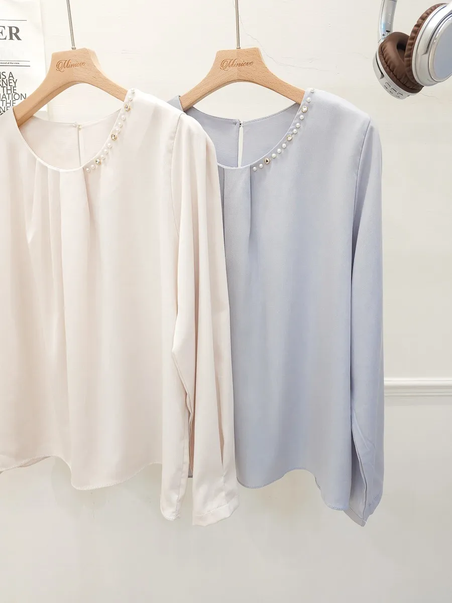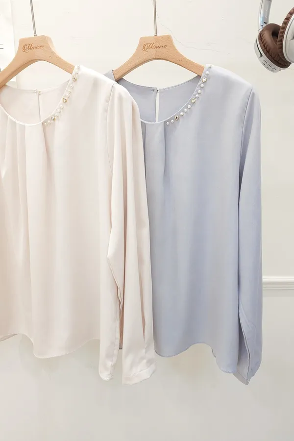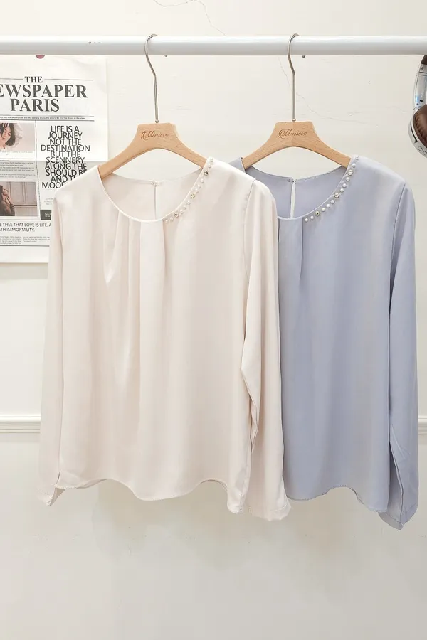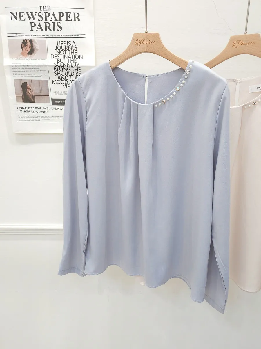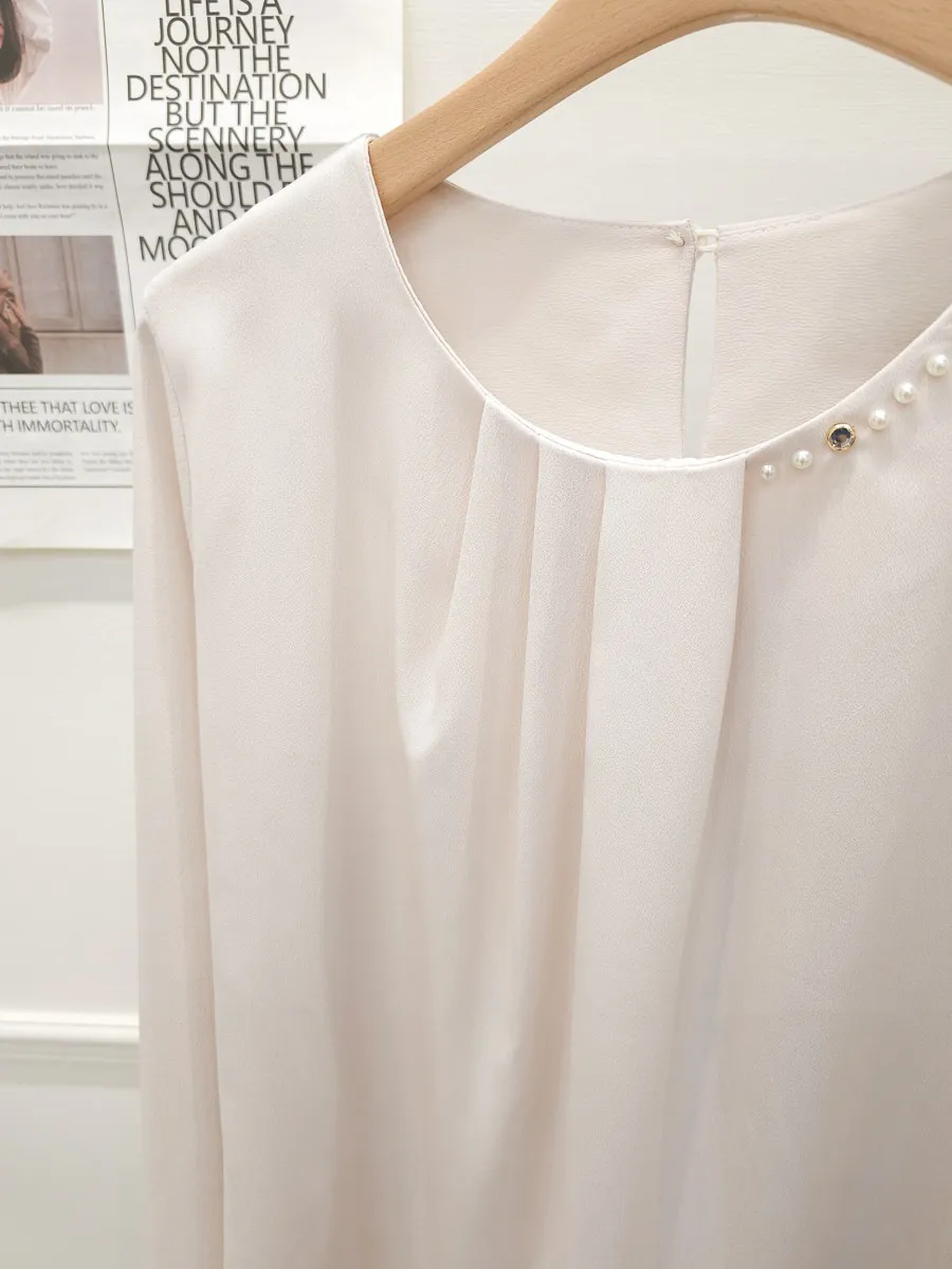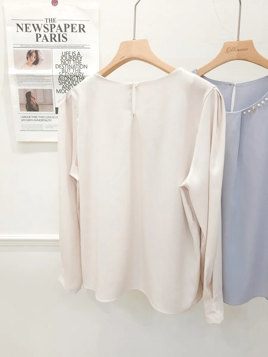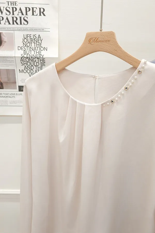 38.正韓 寬摺側領綴珠雪紡上衣 2色