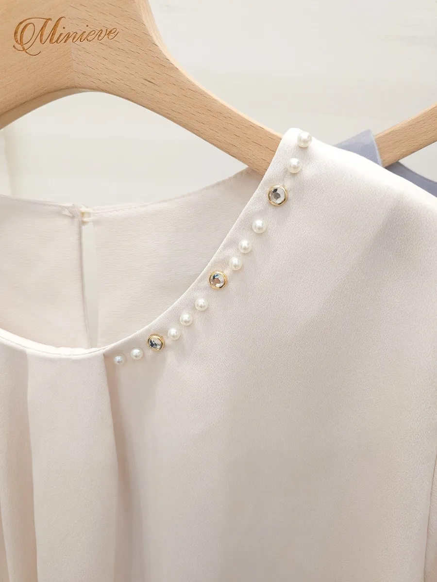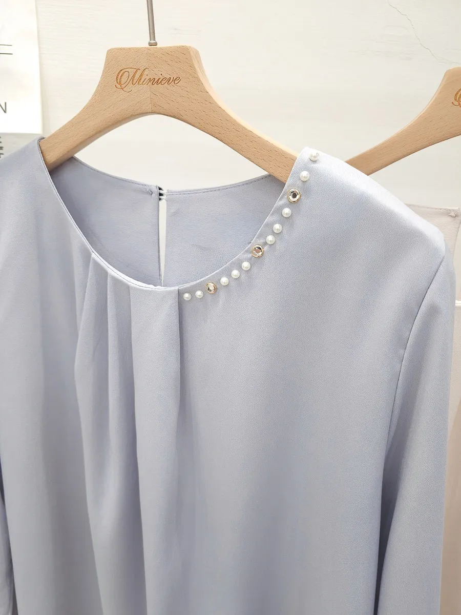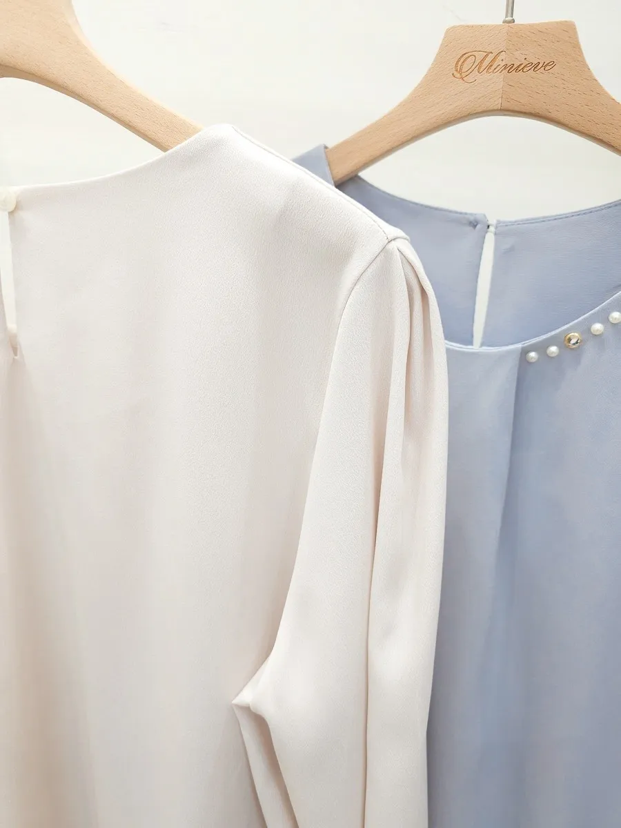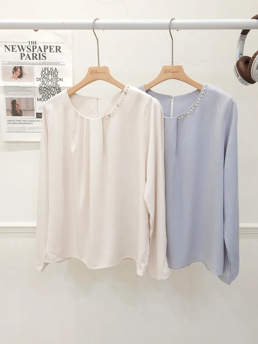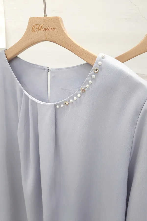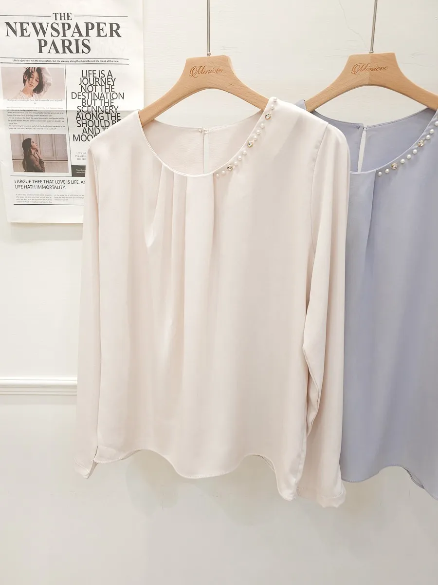 38.正韓 寬摺側領綴珠雪紡上衣 2色