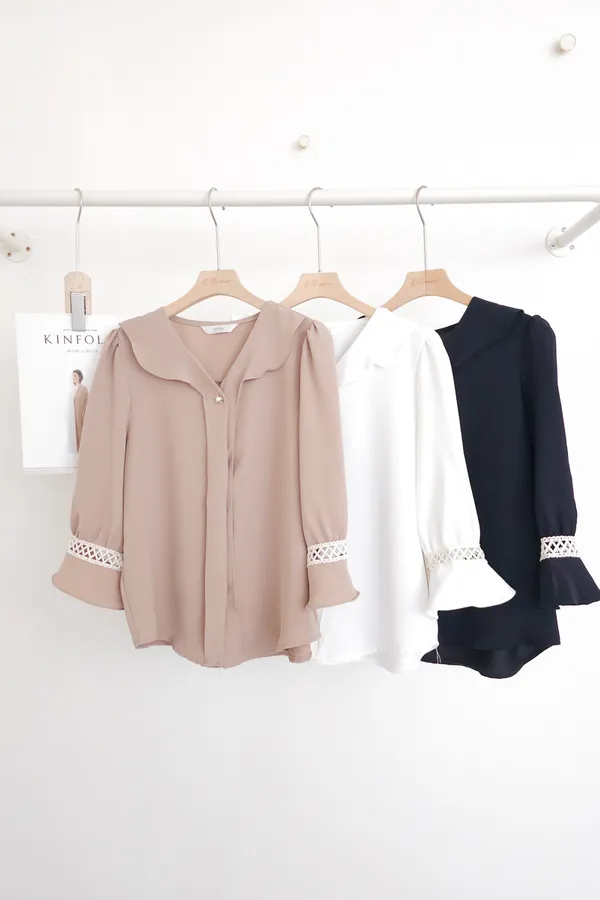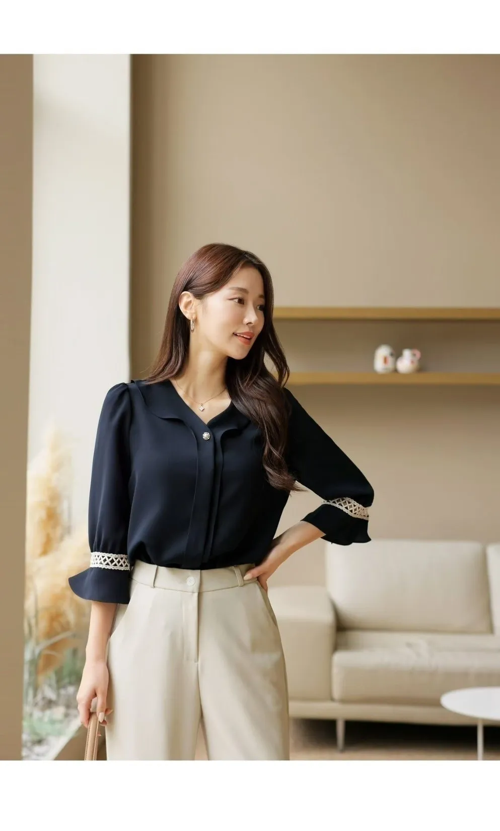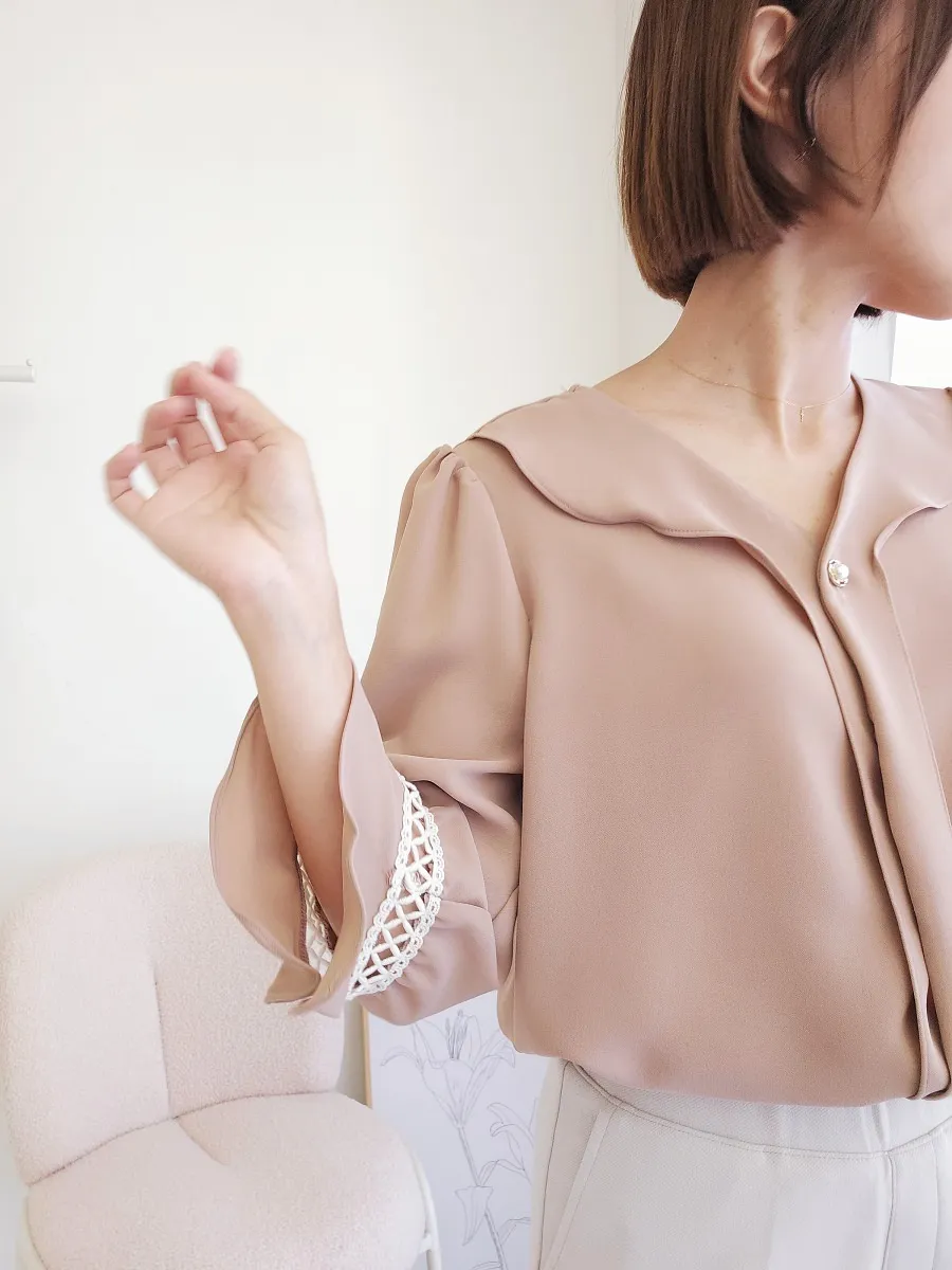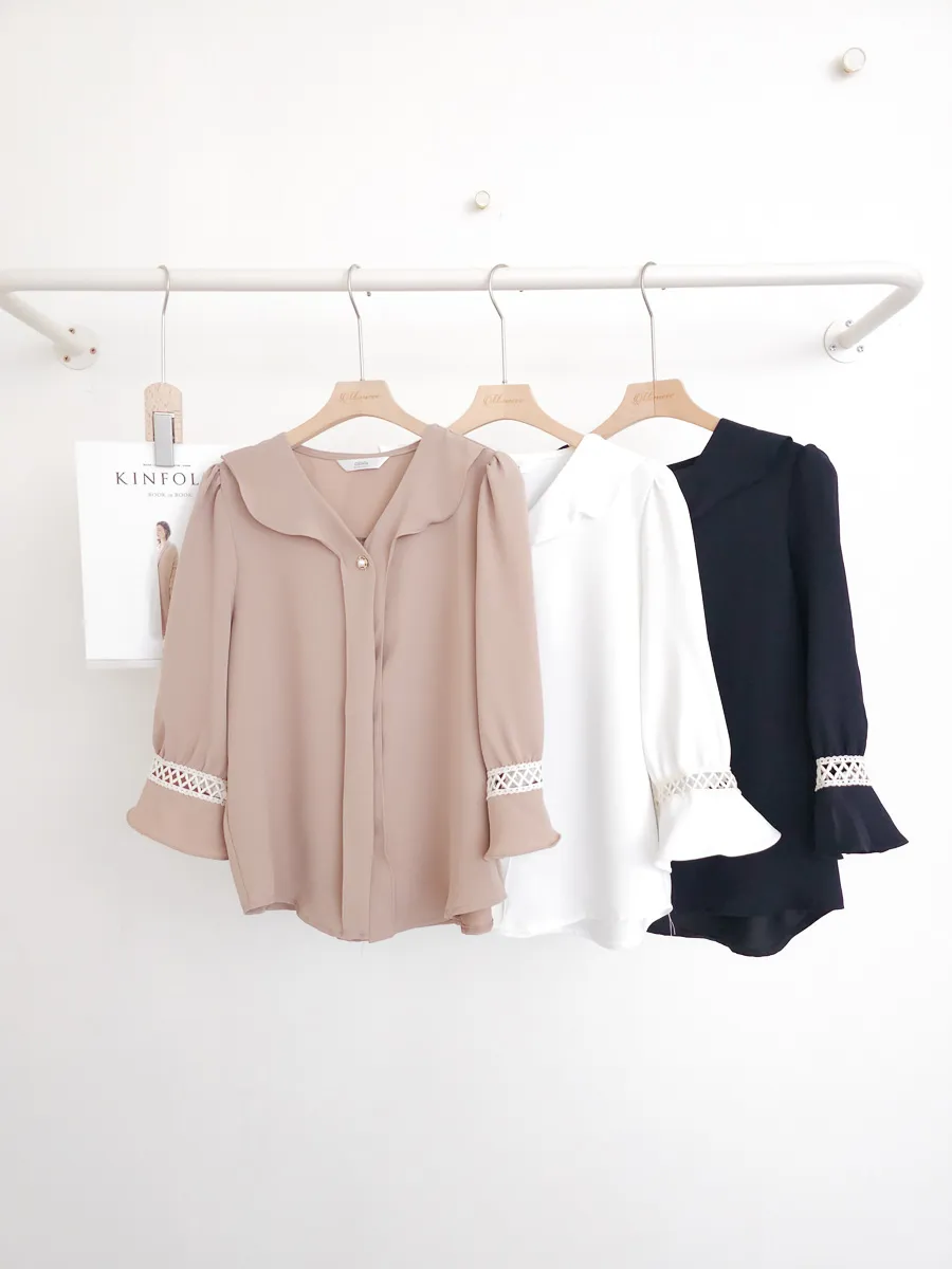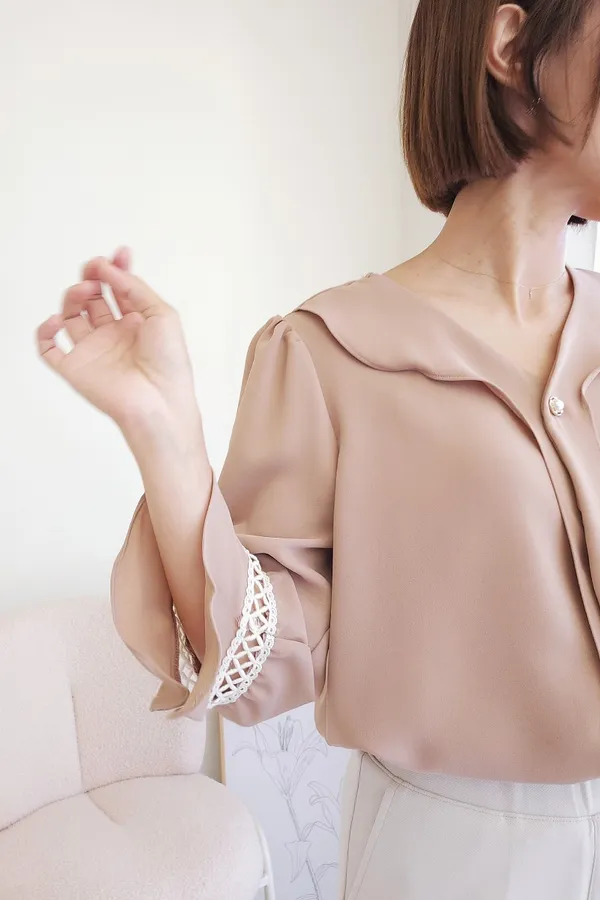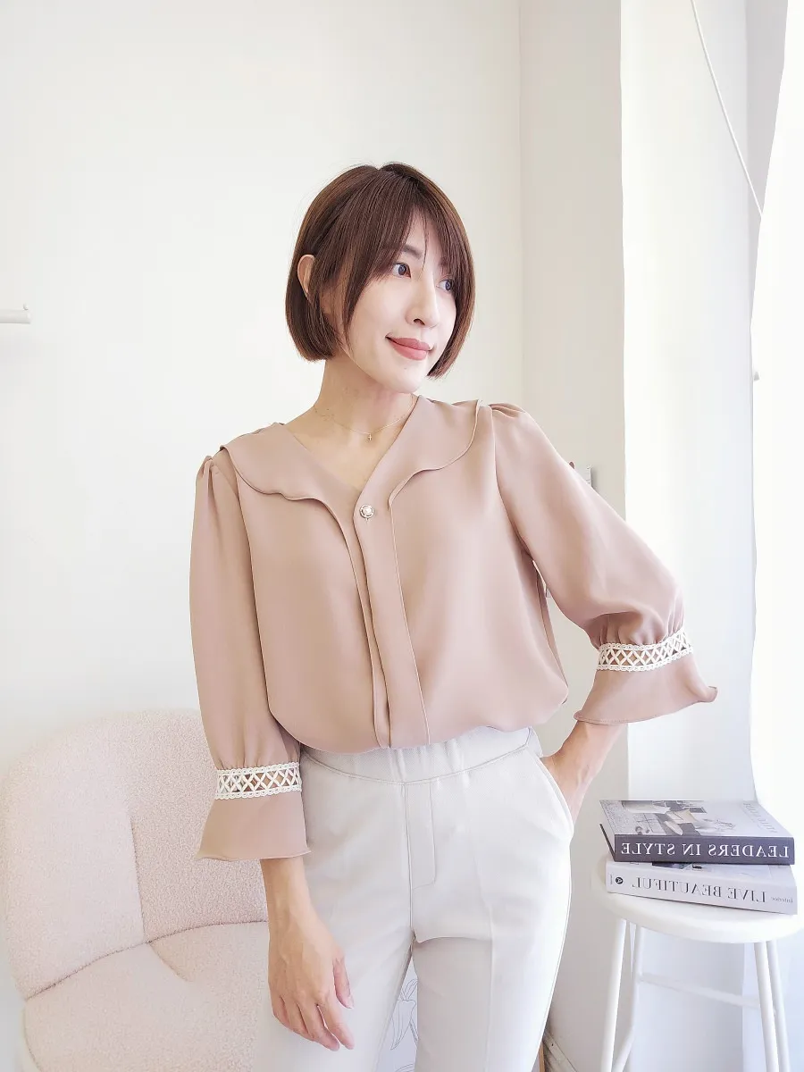 106.正韓 單珠荷葉領鏤空拼袖上衣 3色
