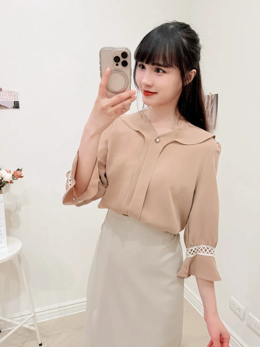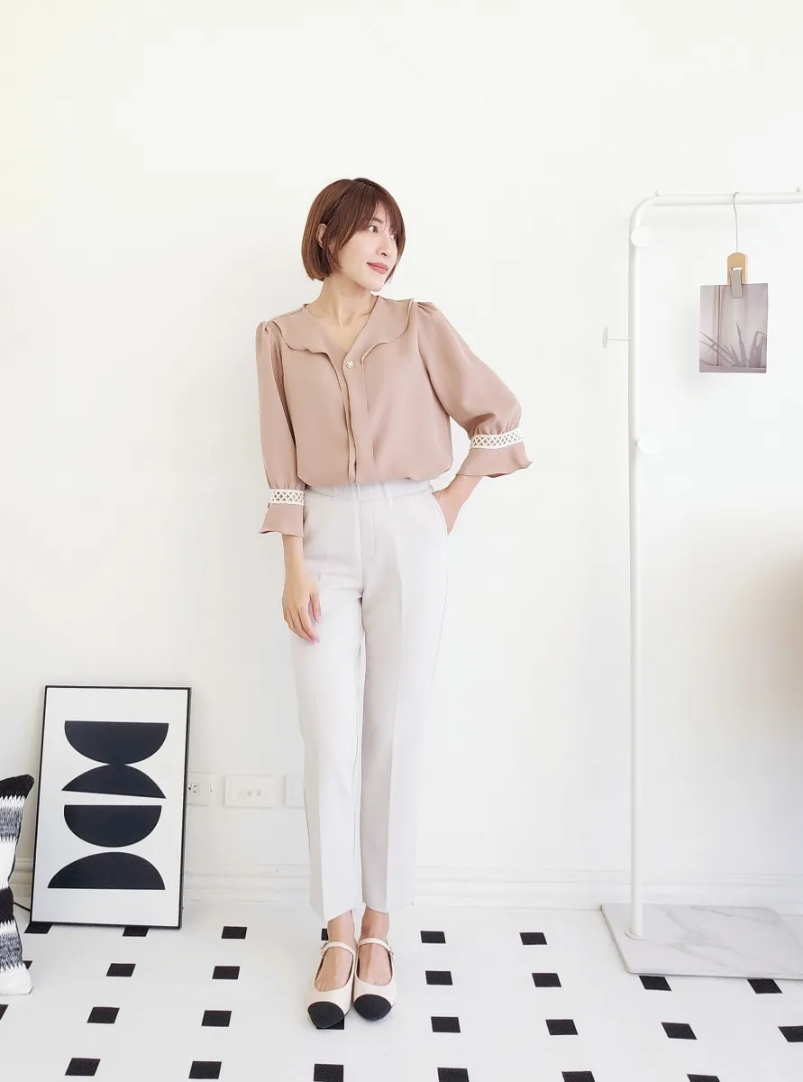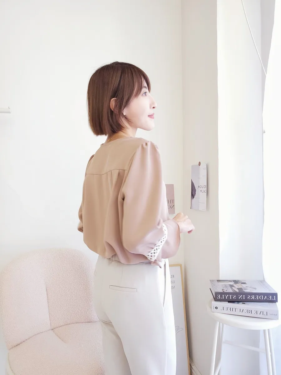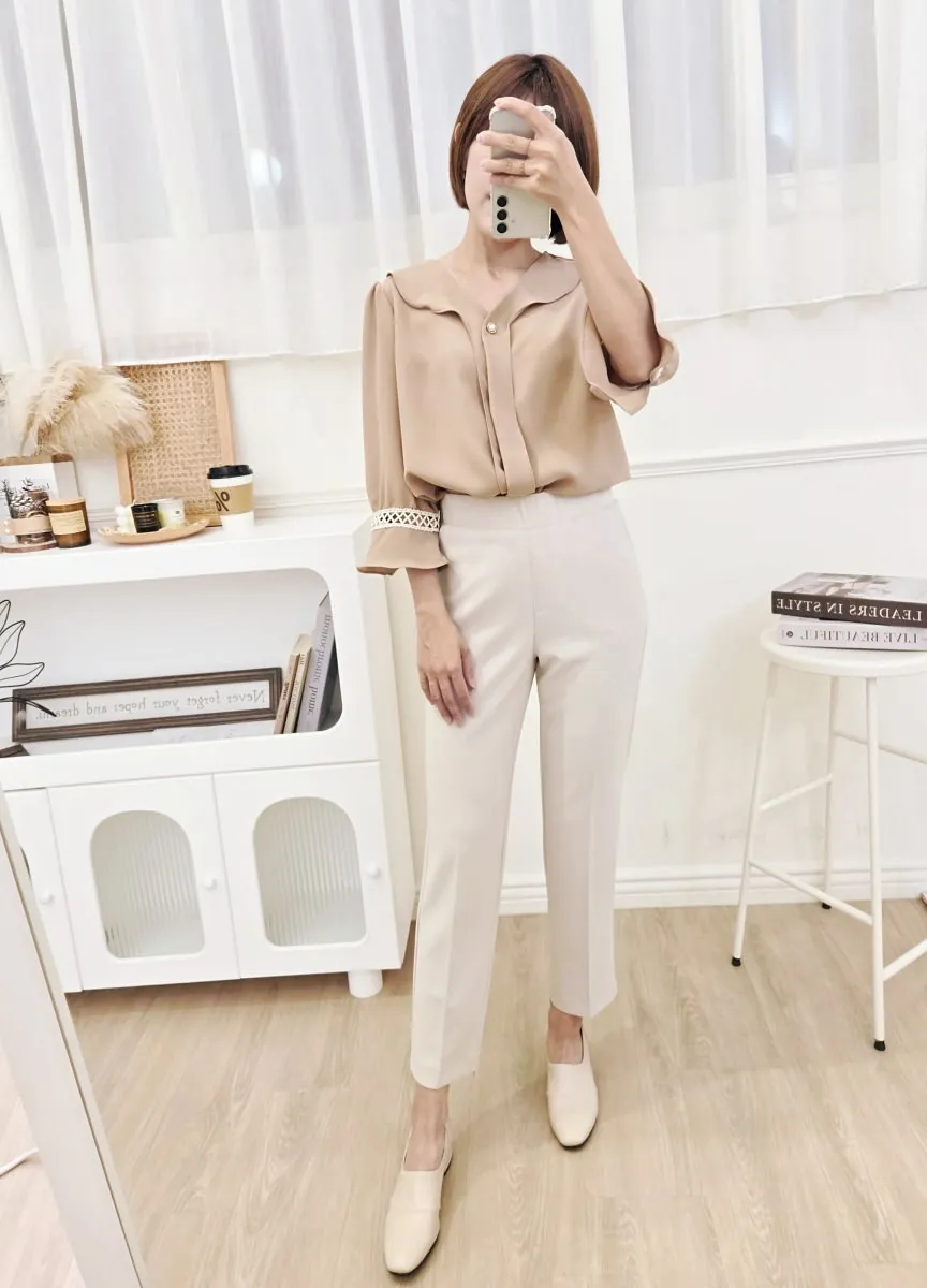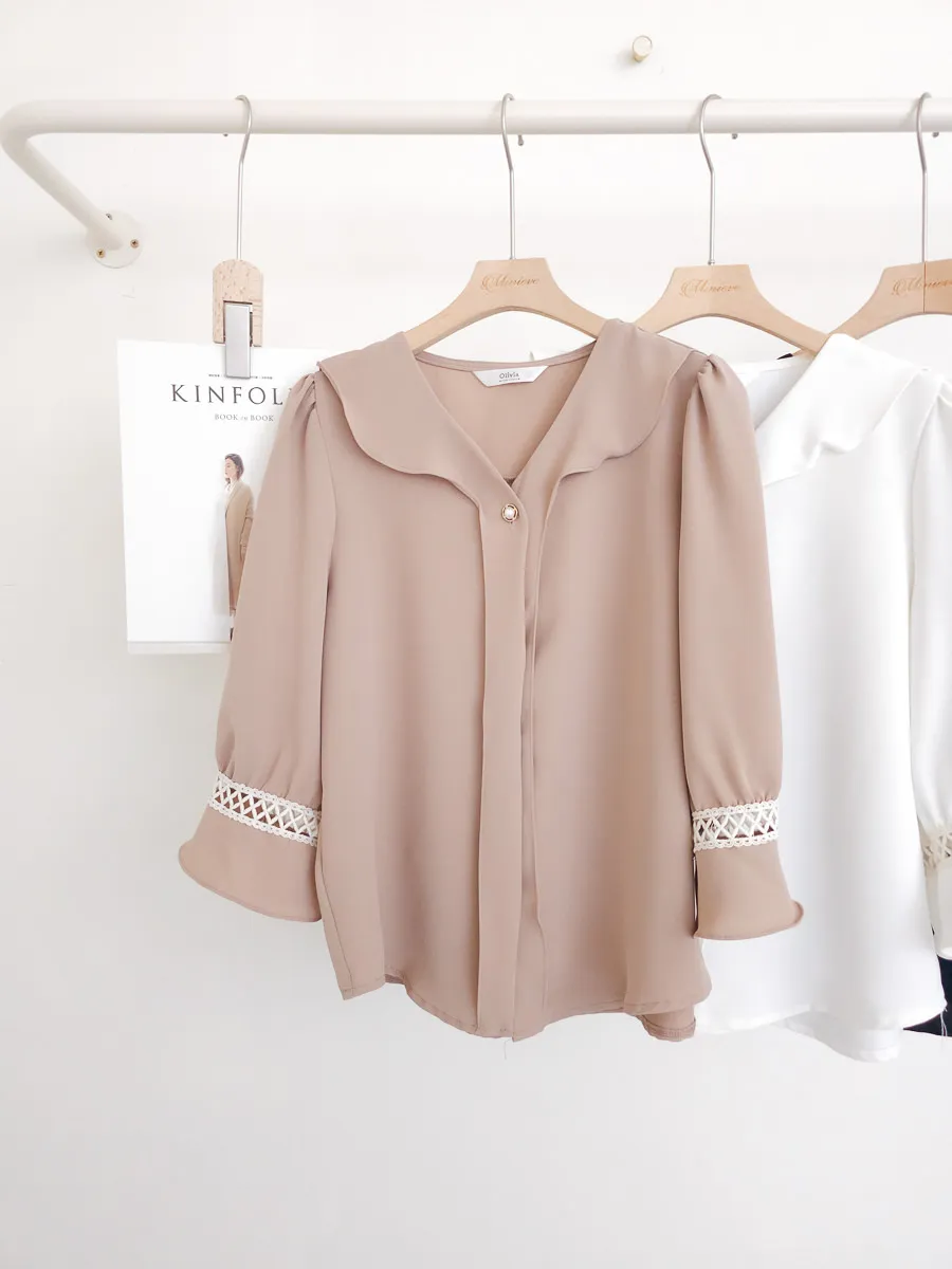 106.正韓 單珠荷葉領鏤空拼袖上衣 3色
