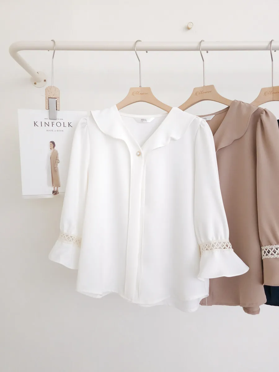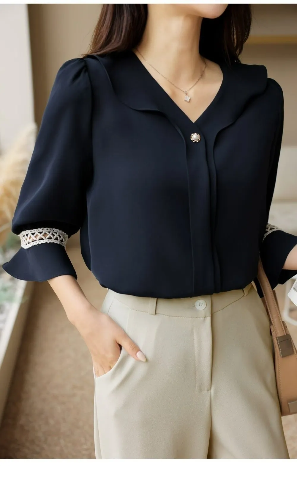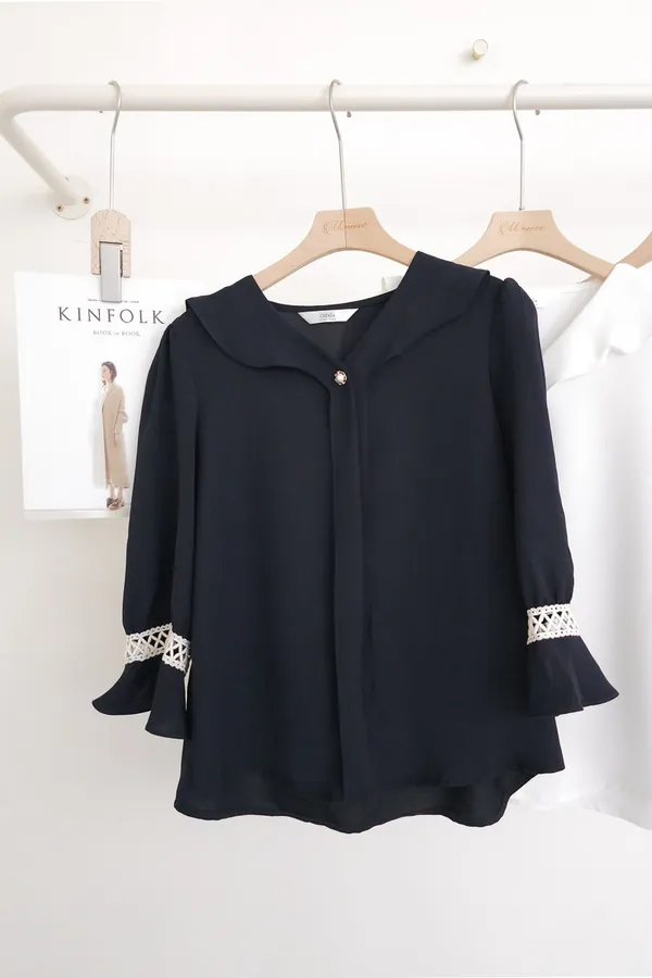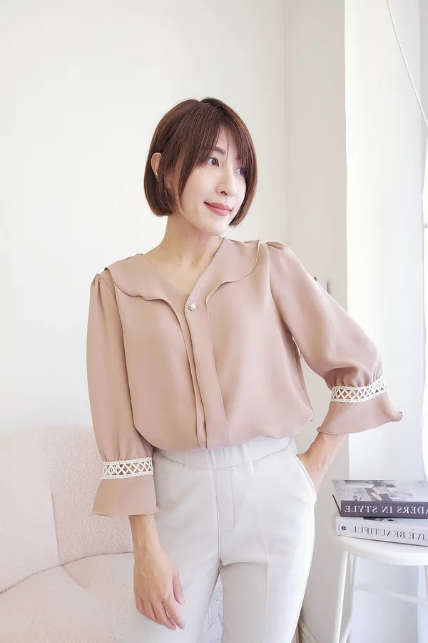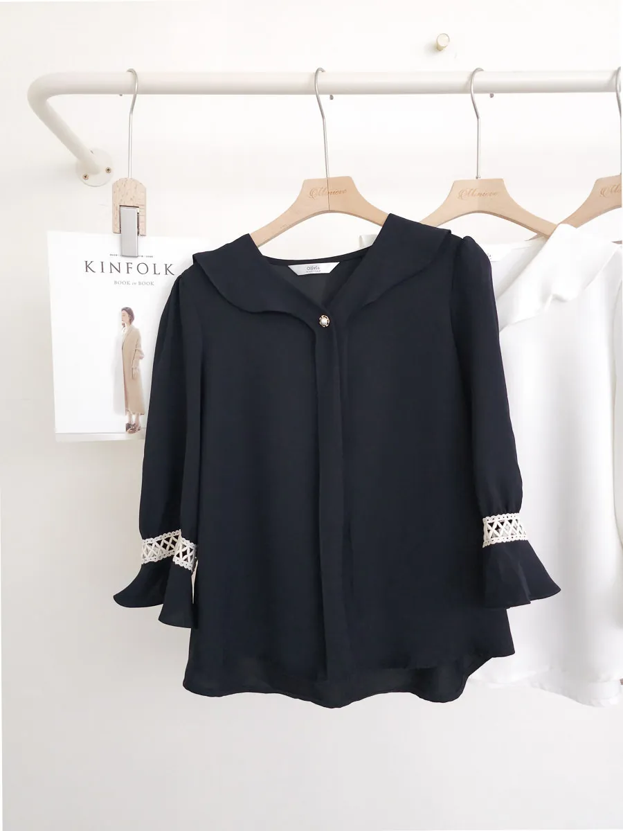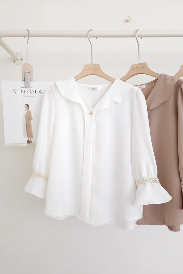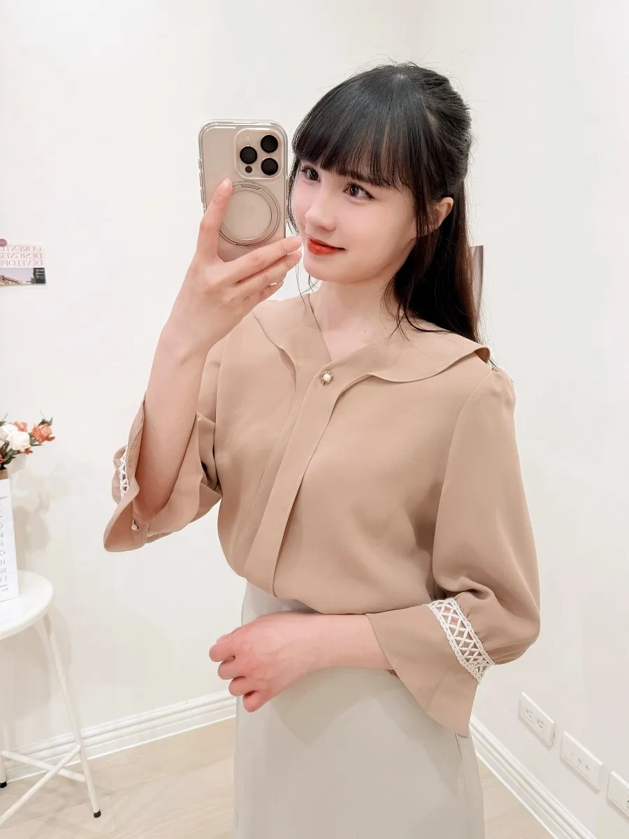 106.正韓 單珠荷葉領鏤空拼袖上衣 3色