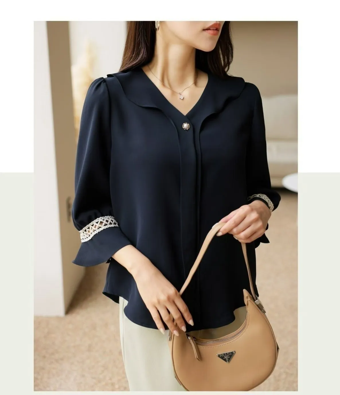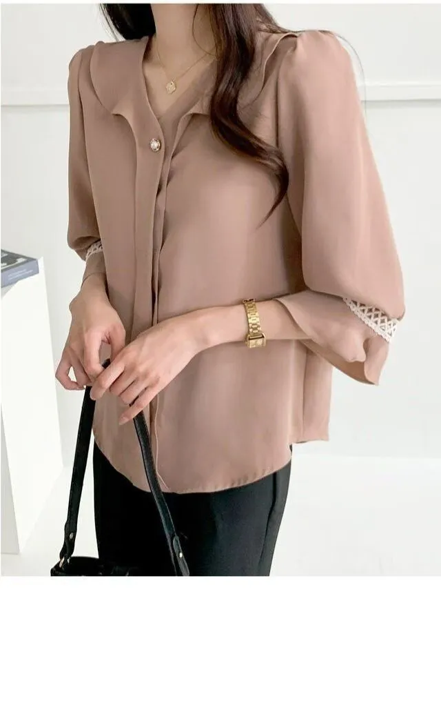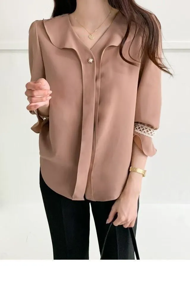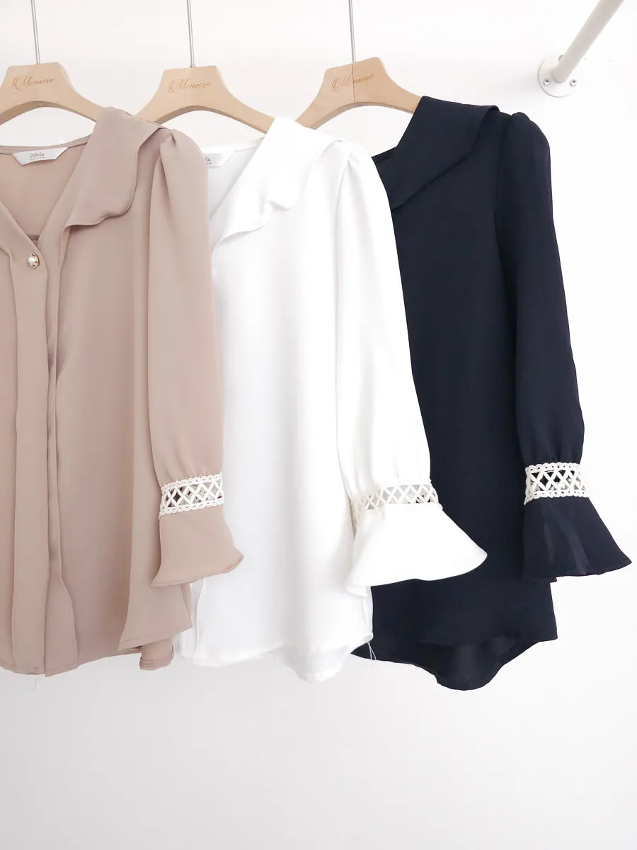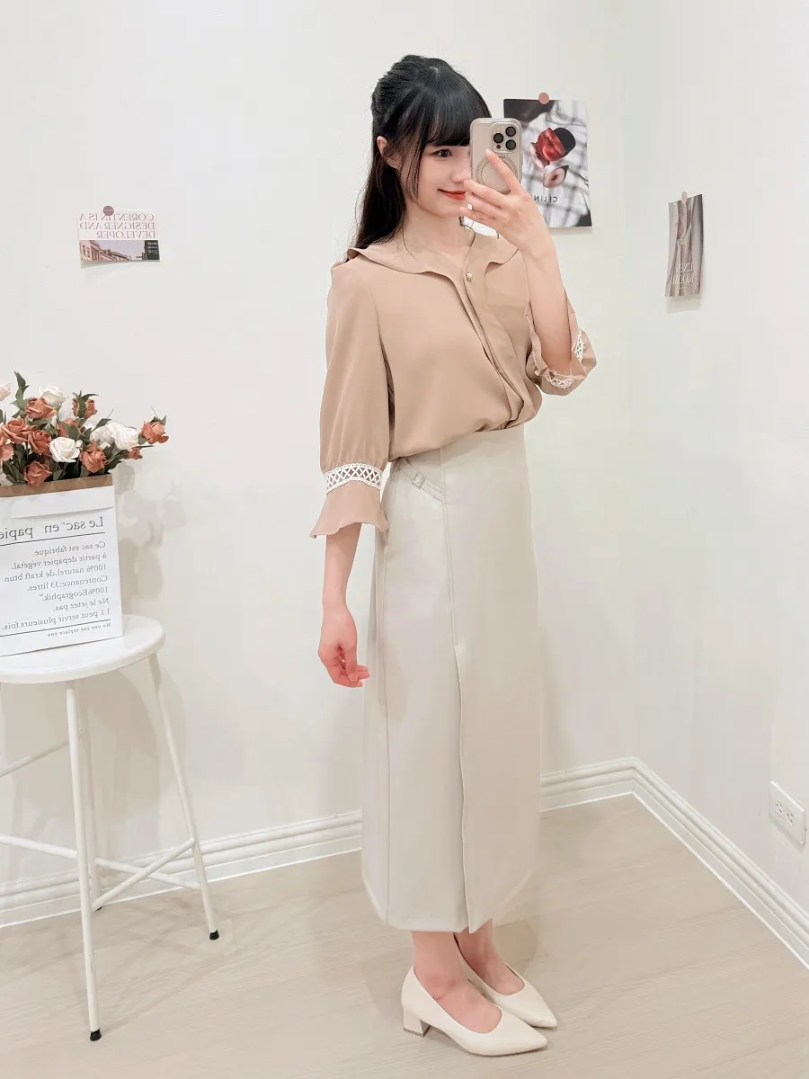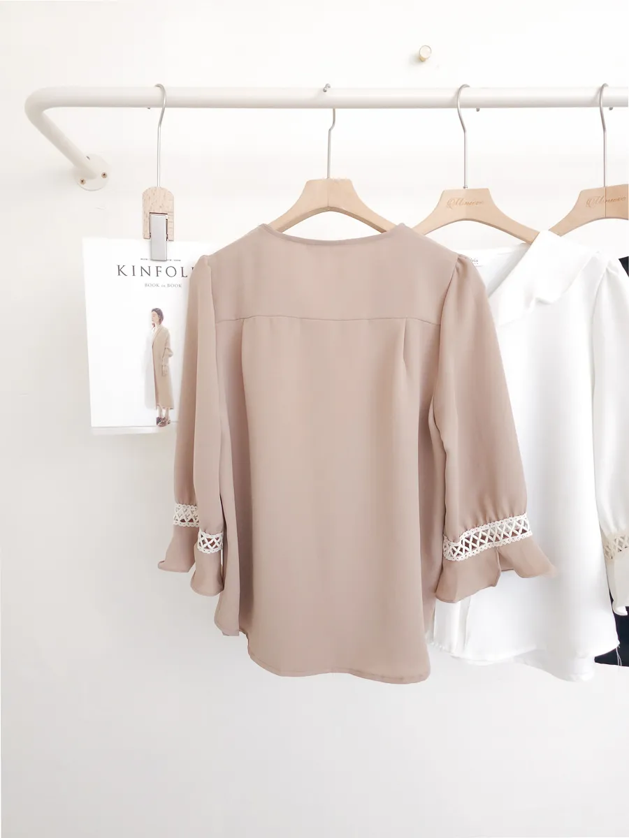 106.正韓 單珠荷葉領鏤空拼袖上衣 3色