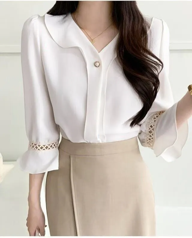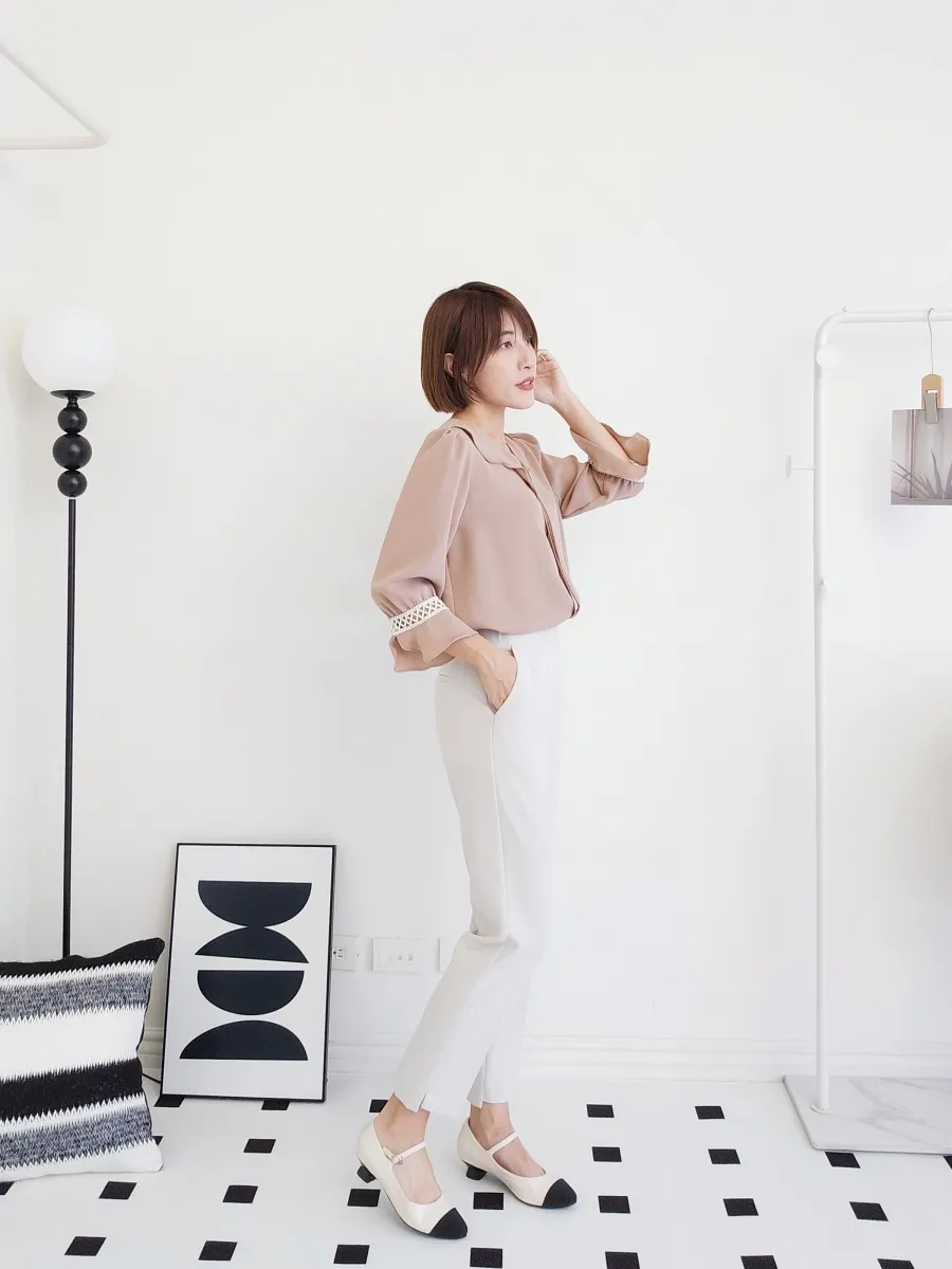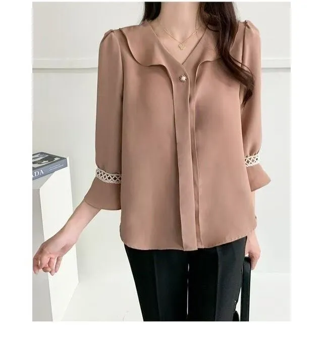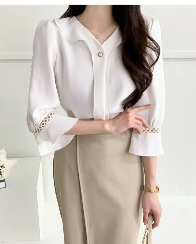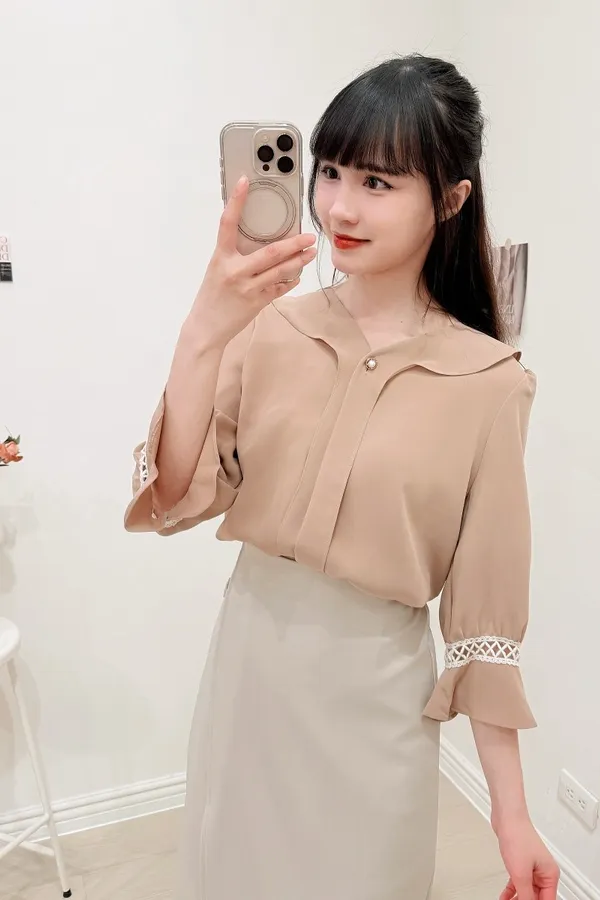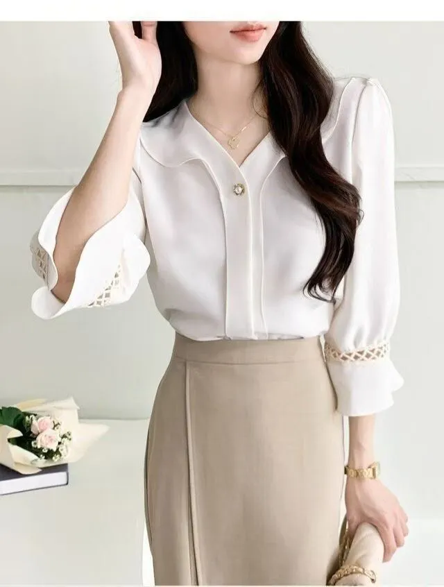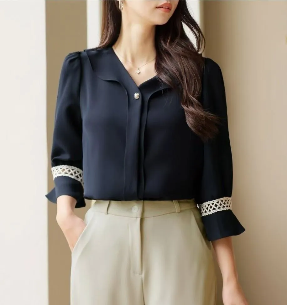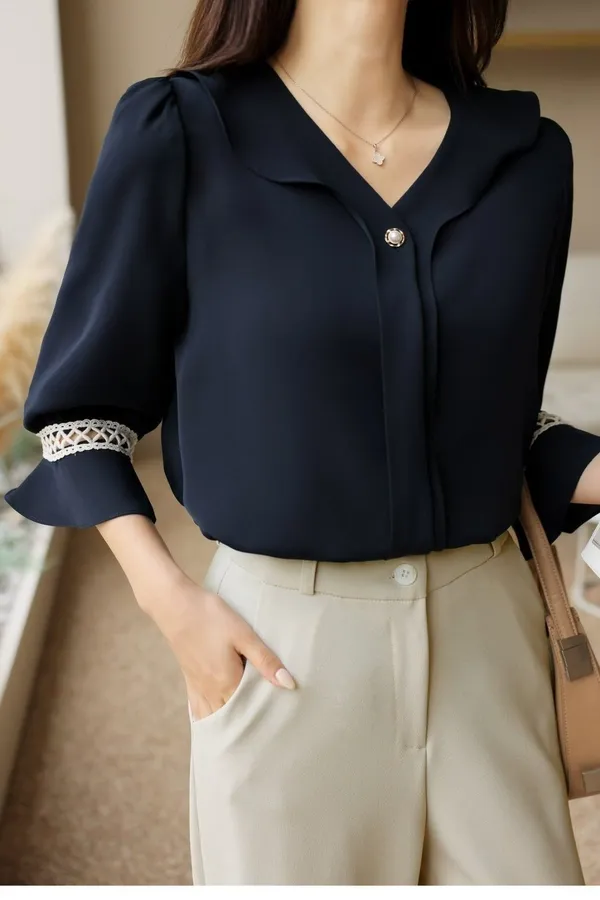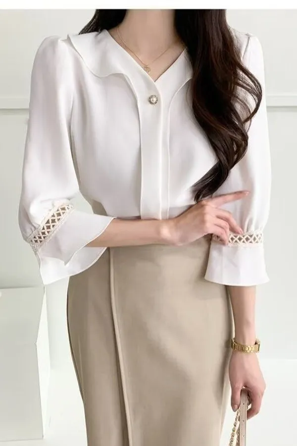 106.正韓 單珠荷葉領鏤空拼袖上衣 3色