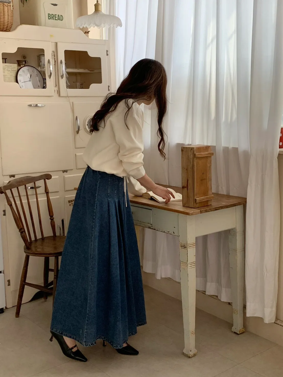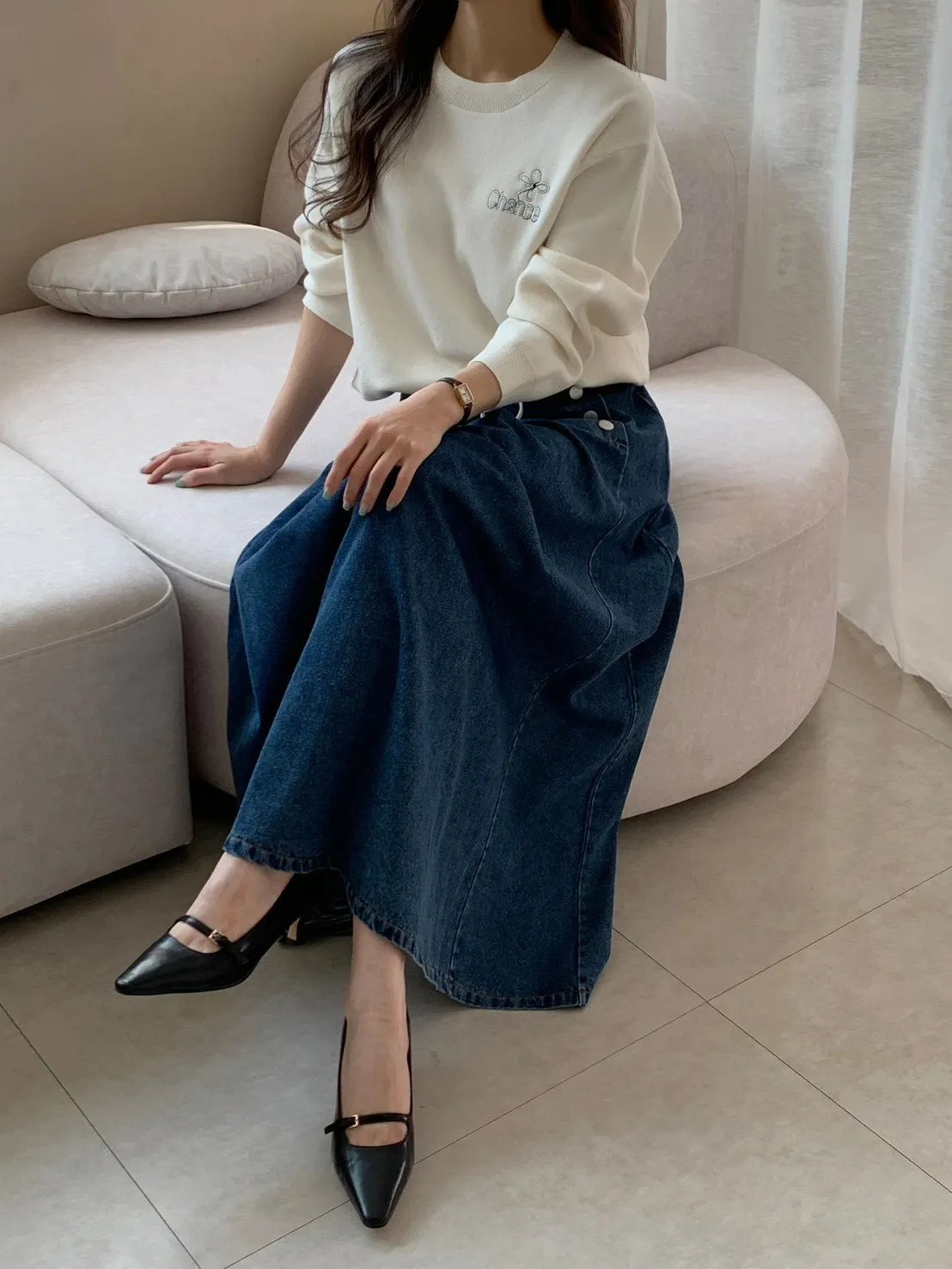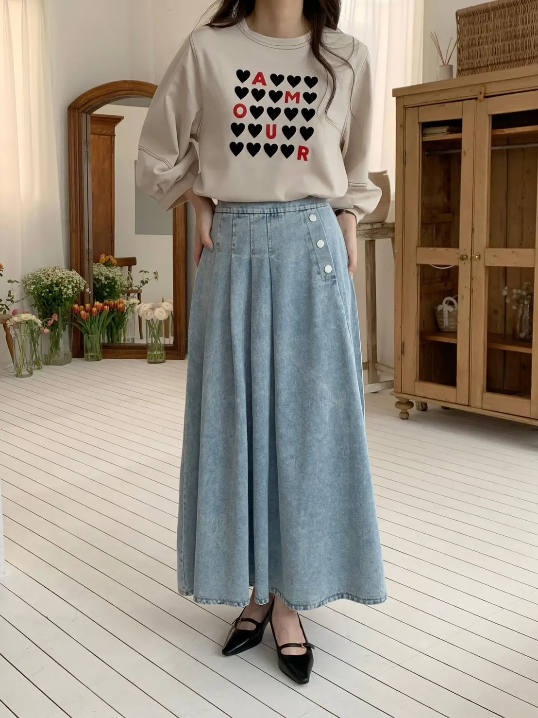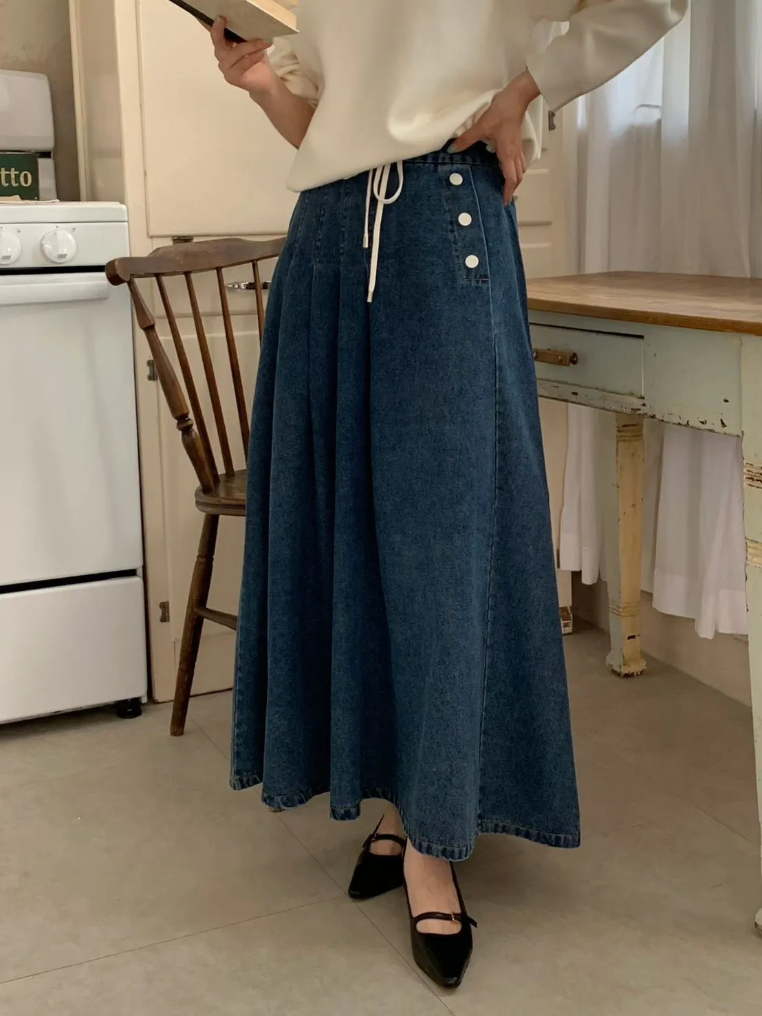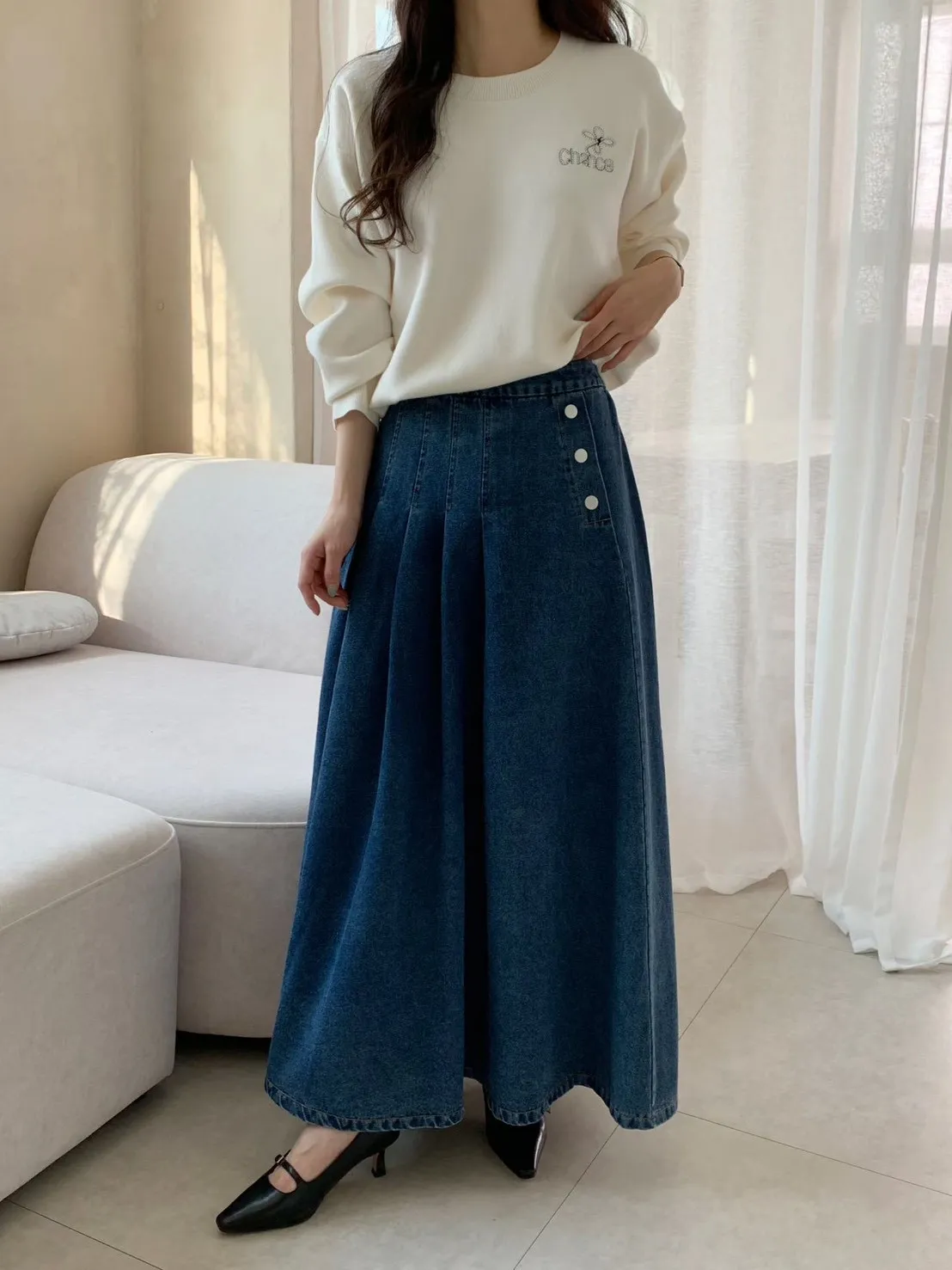 53.正韓 寬摺側釦雪花牛仔裙 2色