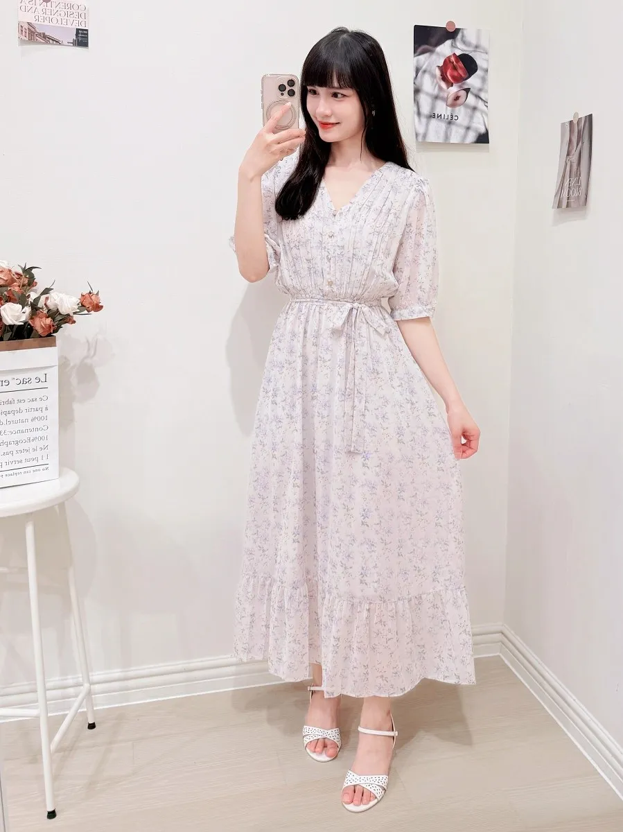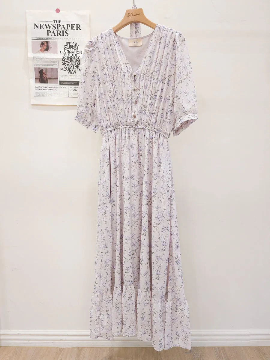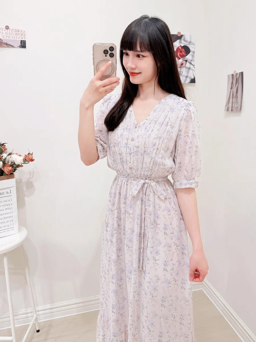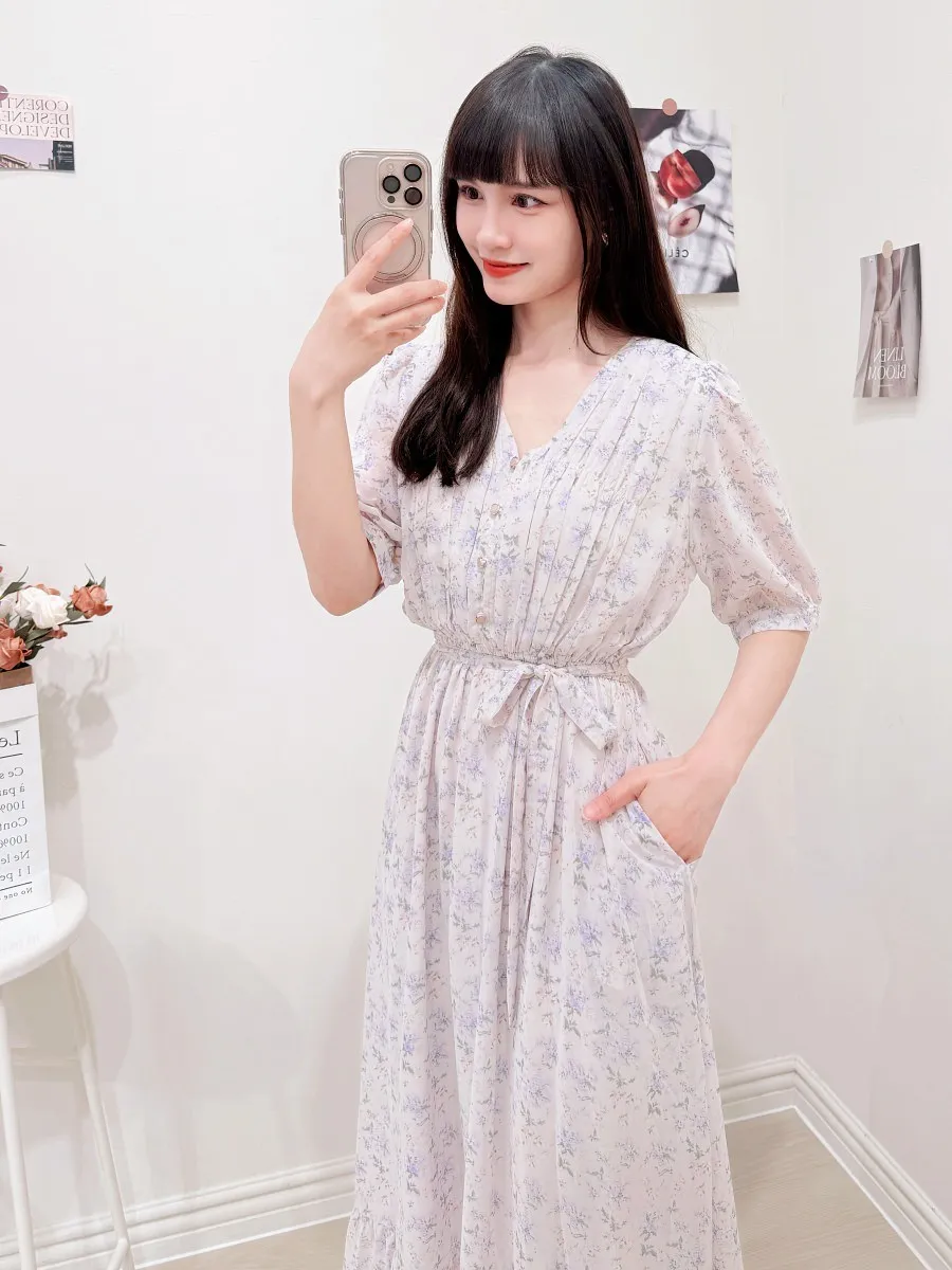 117.細摺排釦層次碎花洋裝