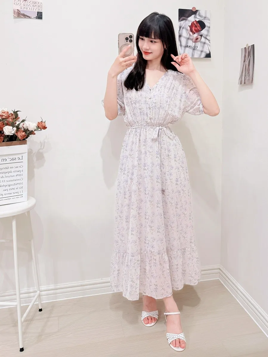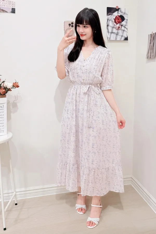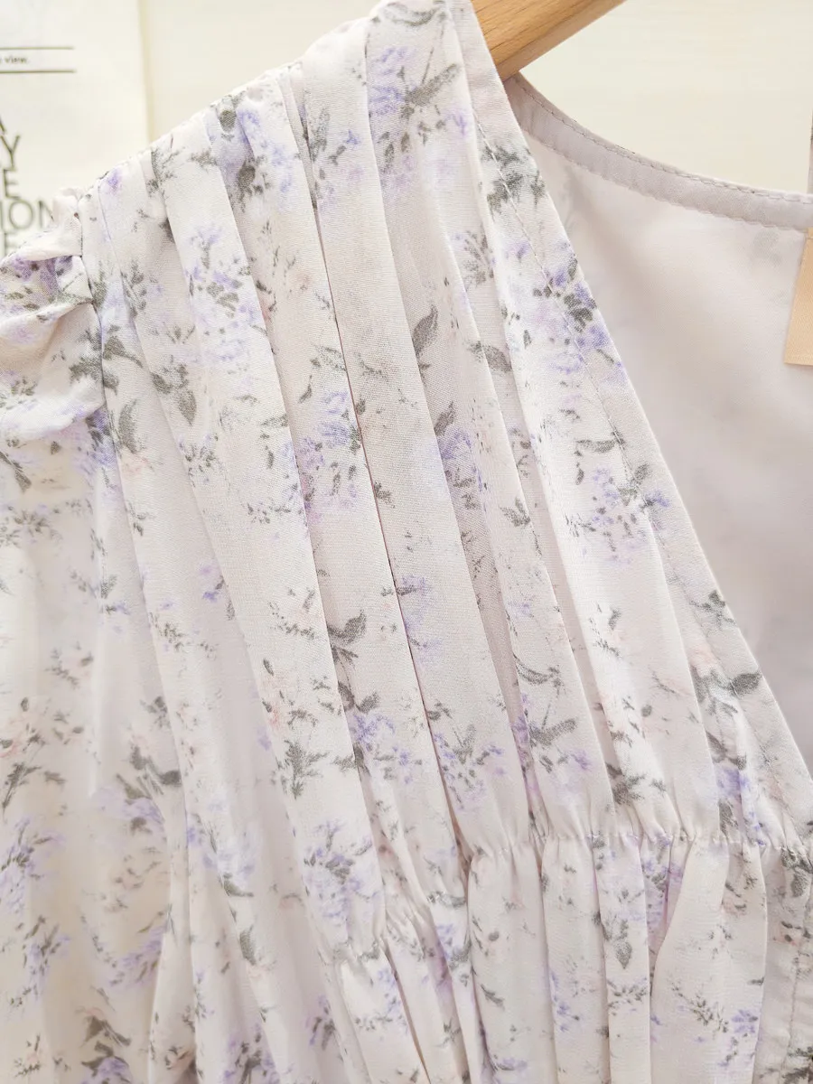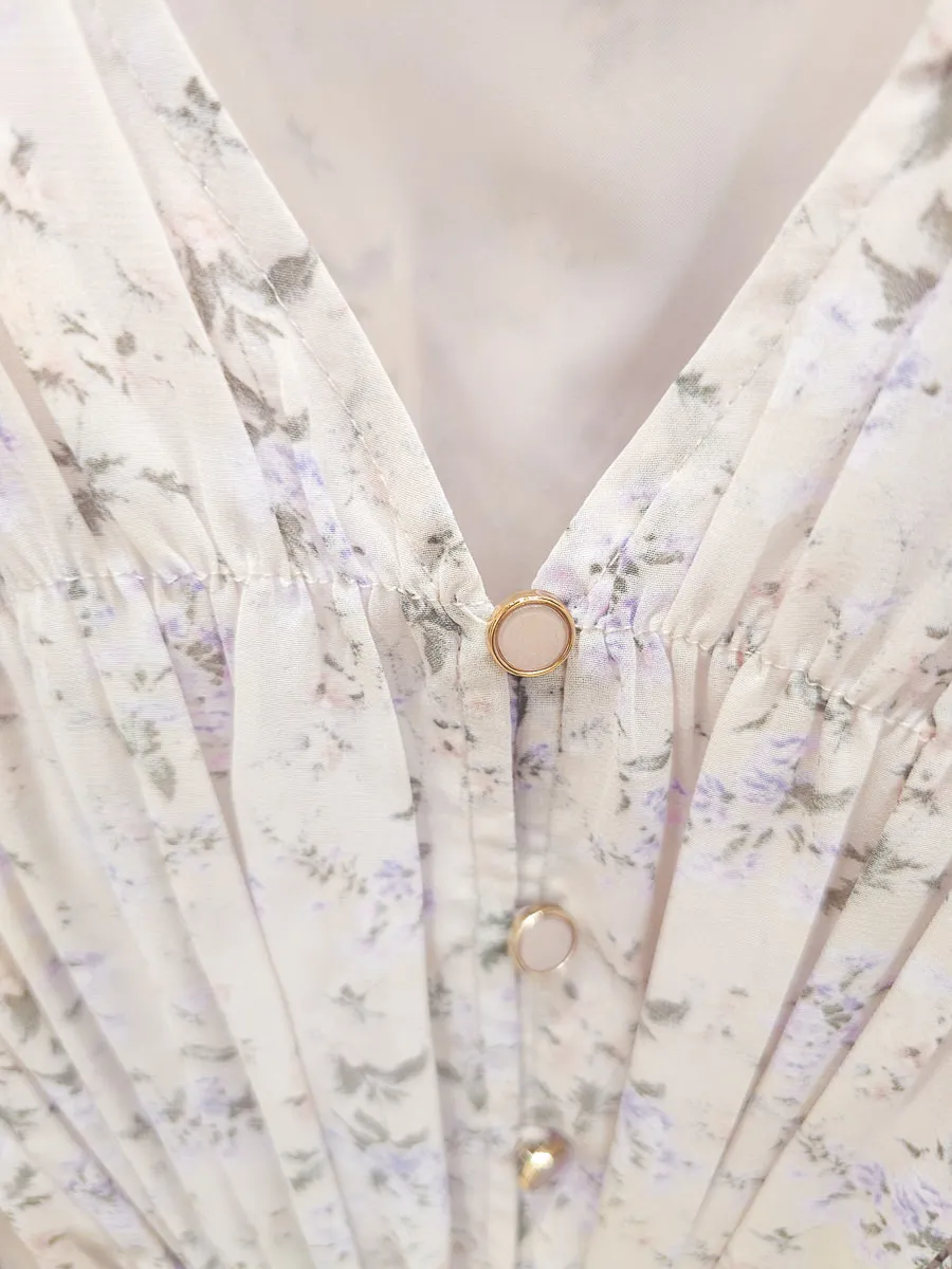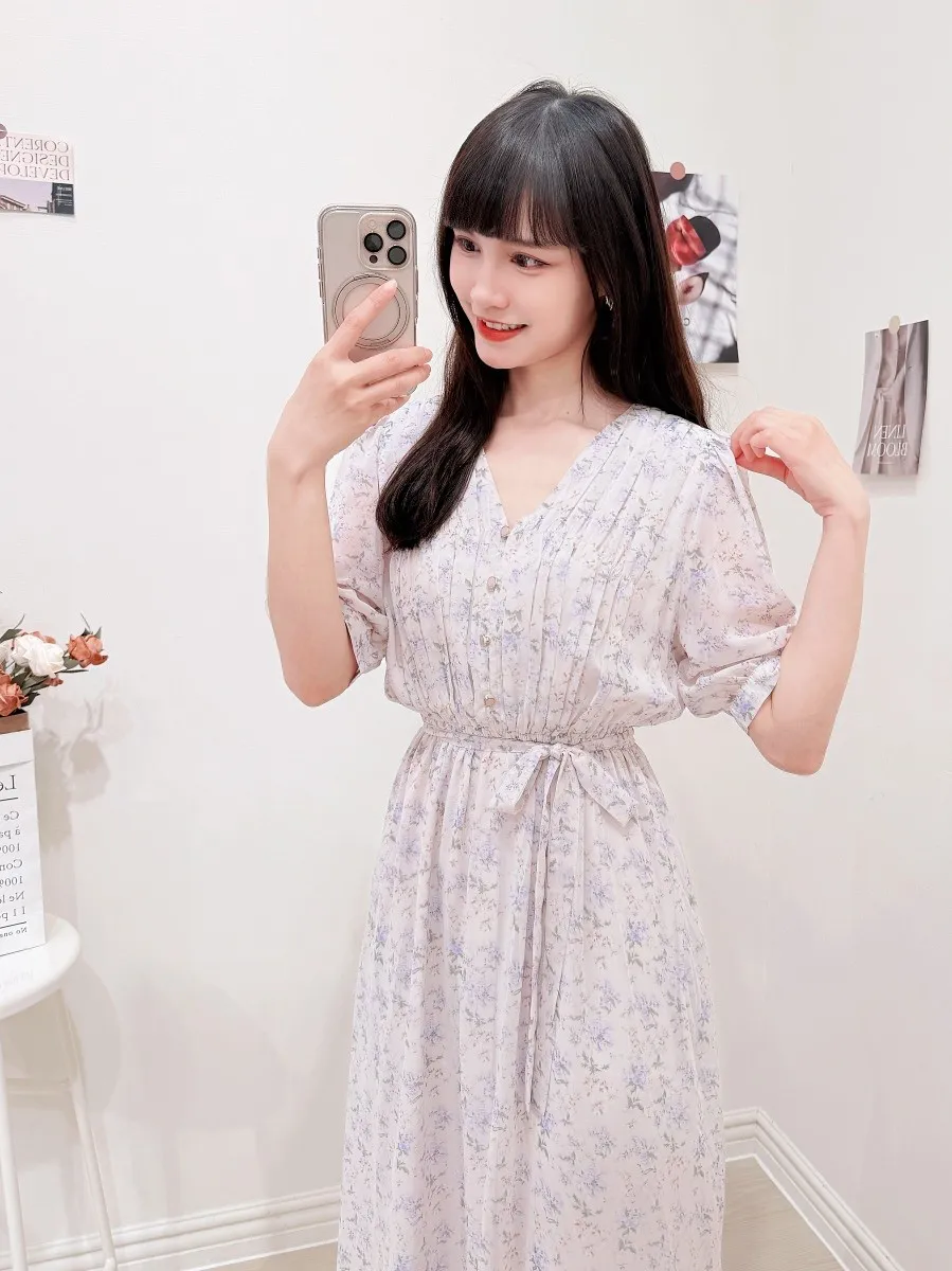 117.細摺排釦層次碎花洋裝