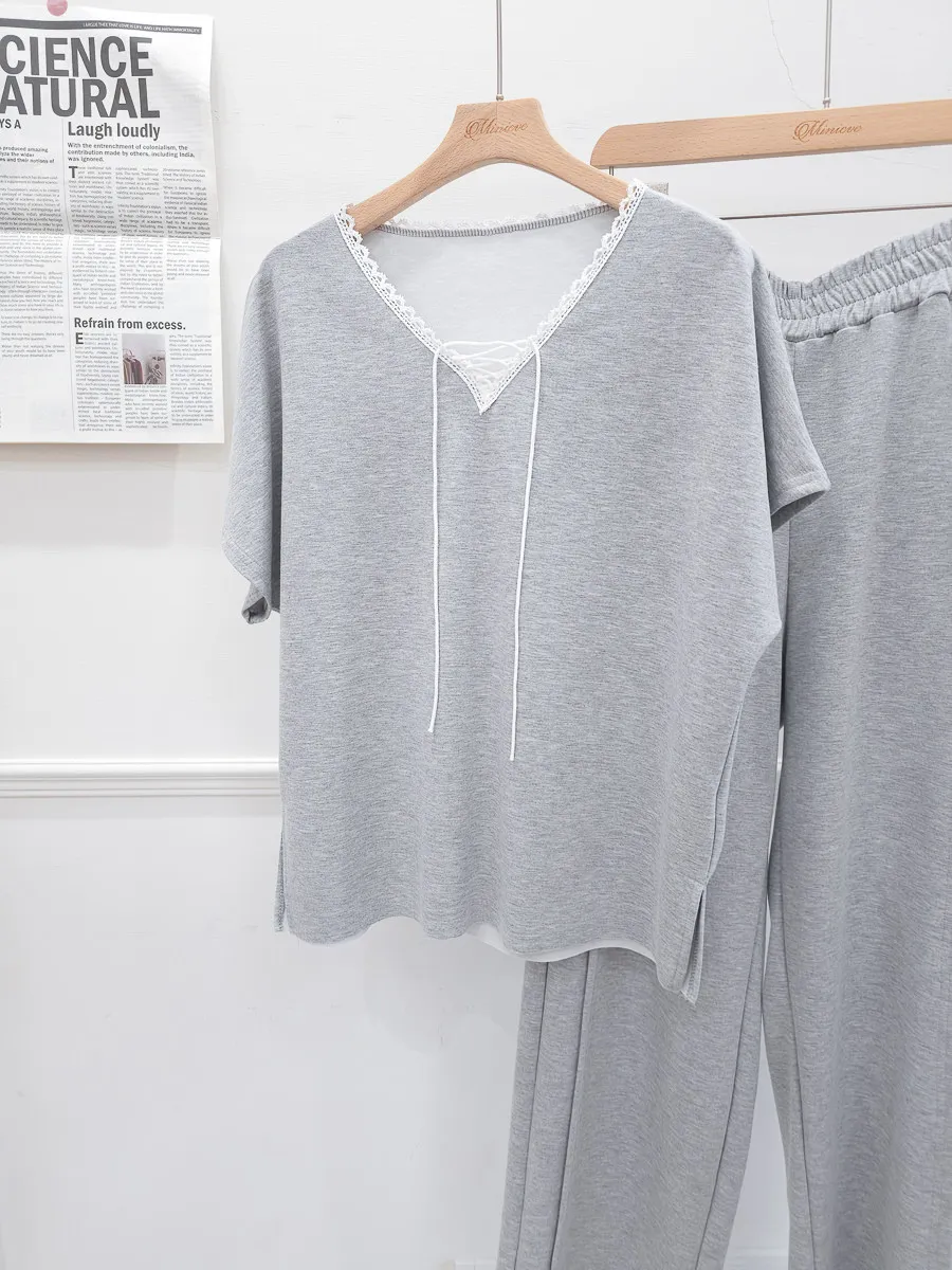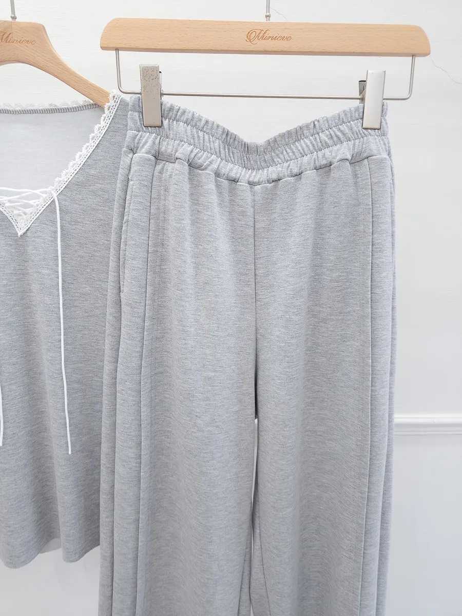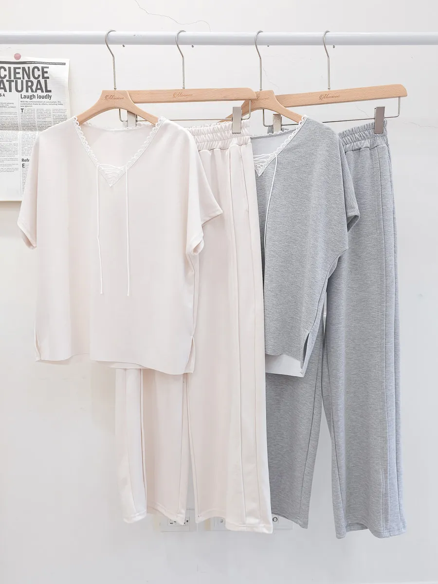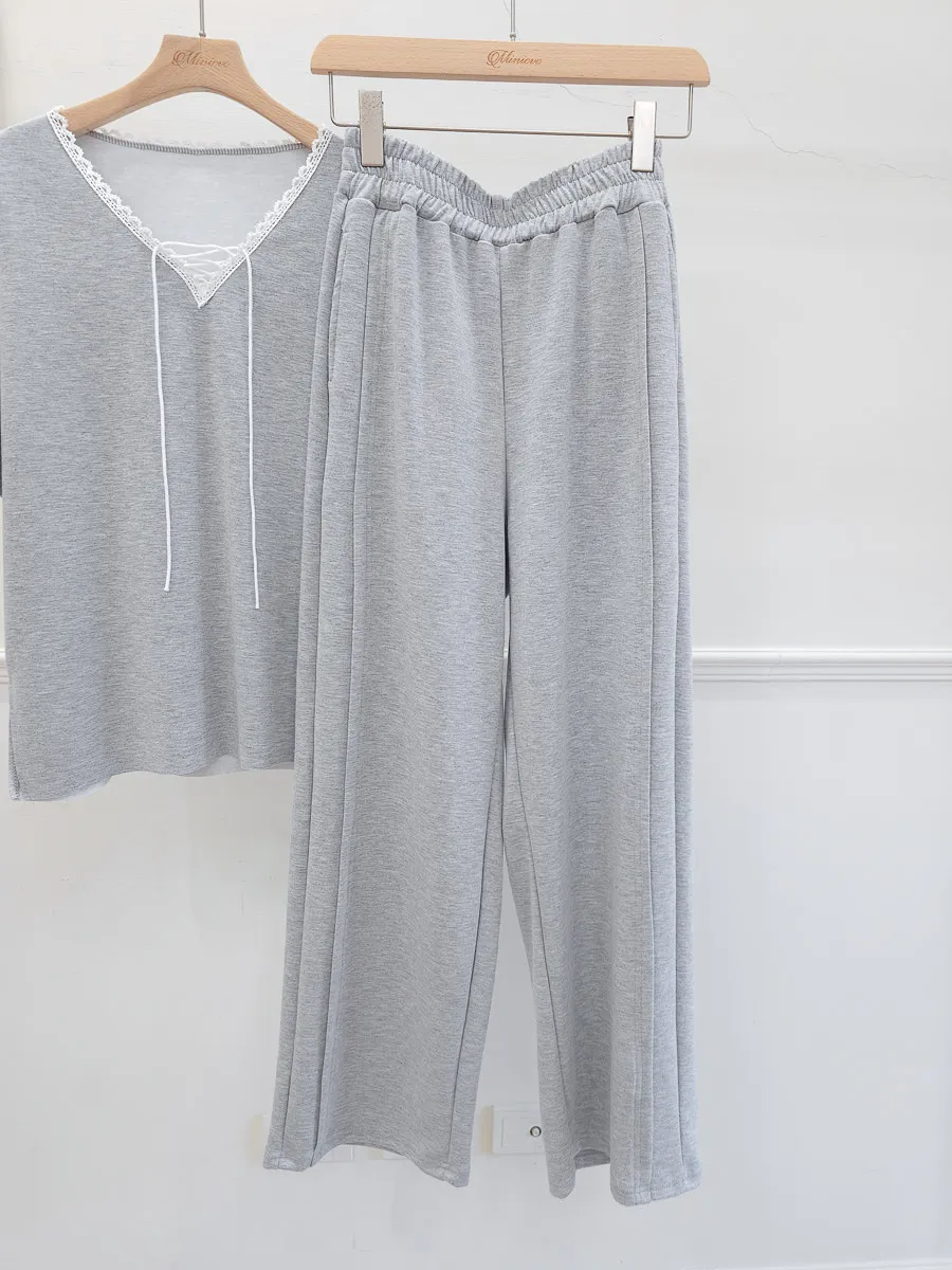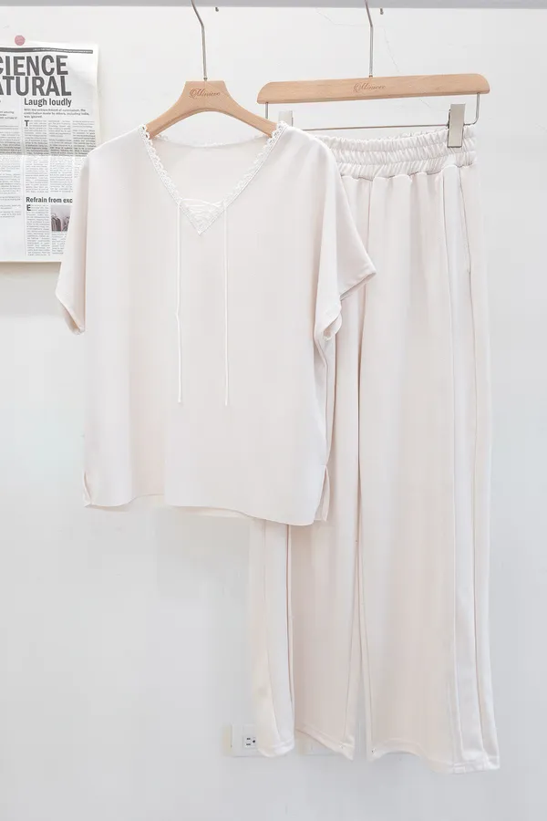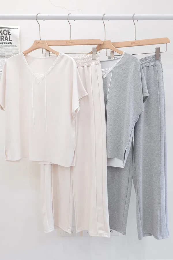 64.正韓 花邊綁帶領上衣棉褲Set 2色